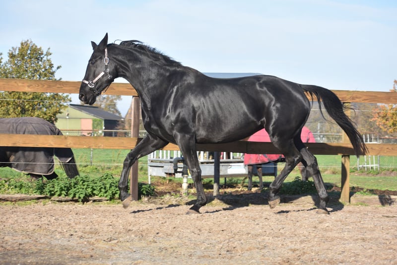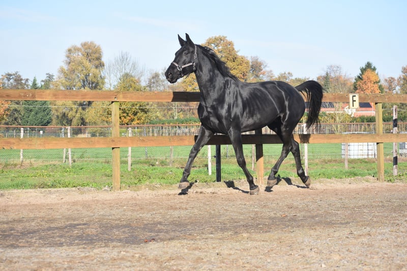 Meet Paulina: truly a horse straight out of a fairytale. With her deep black coat, expressive eyes, and beautiful, well-built conformation, she is a real eye-catcher. Paulina is 5 years old, approximately 16.1 hh, and boasts an exceptional pedigree: Kjento x Lord Leatherdale. We acquired her directly from her first owner, where she was raised with great care from a young age and has been handled gently. She is a genuine sweetheart with a gentle temperament. She can stand quietly in the stable on her own without any issues, despite being very social. Paulina has recently been given a full clinical and radiological clearance, including X-rays of her back. We are currently continuing her training, which she performs with great talent and dedication. As her education progresses, the price will increase. Price: €9,750 including branded saddle and saddle pad.