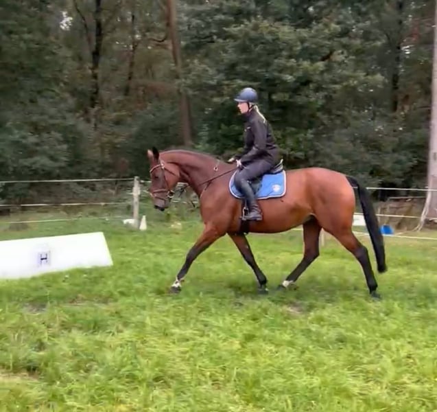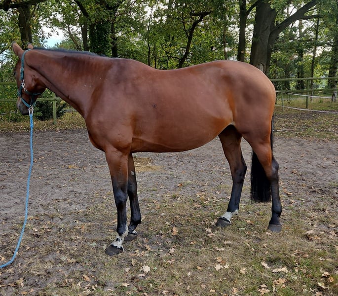 Ihr sucht den 6er im Lotto? Zum Verkauf steht diese 6-jährige KWPN Stute „Ominka-Star“. Sie stammt ab von Pommerol de Muze (Emerald van´t Ruytershof x Kannan) aus einer Mutter von Zapatero VDL x Cantos. Sie ist eine sehr typvolle Stute und ist ca. 171cm groß und deckt sehr gut ab. Ominka hatte letztes Jahr ein Fohlen und wurde daher erst dieses Jahr angeritten. Sie ist sehr leicht in Anlehnung zu reiten und hat genügend Go mit super Rittigkeitswerten. Sie ist sehr lernwillig und bemüht sich stets alles richtig zu machen, dabei ist sie auch von schwächeren Reitern leicht zu bedienen und gibt Sicherheit. Beim Freispringen überzeugt sie mit toller Bascule und schnellen Reflexen. Unter dem Reiter zieht sie gut zum Sprung, ist bereits einen kleinen Parcours inkl. Kombi und Wassergraben gesprungen und verzeit auch bei schwächeren Reitern mal einen Fehler. Im Gelände ist sie stets eine coole Socke und recht unerschrocken. Im Umgang ist Ominka ein absoluter Schatz: ihre ruhige, entspannte und verschmuste Art machen sie zu einem perfekten Amateurpferd! Sie strahlt einfach immer Ruhe aus und ist eine richtig treue Seele! Sie wäre der perfekte Freizeitpartner oder auch für die Springsport oder den Hunterbereich interessant. Natürlich ist sie schmiede- und verladefromm, läuft barhuf, hat die Zähne gemacht bekommen und wurde bereits ohke besondere Befunde geröntgt. Aktuell steht sie in der gemischten Herde im Offenstall, kennt aber auch Boxenhaltung. Sie ist dabei im mittleren Rang. Nun sucht sie das passende Zuhause, indem sie mit ihrem neuen Besitzer durch dick und dünn gehen kann. Probereiten nach Vereinbarung jederzeit möglich, hierfür werden zum Schutz vor Reittourismus 30€ fällig. Weitere Informationen bitte AUSSCHLIESSLICH unter 016095972290, keine Whatsapp oder Nachrichten!