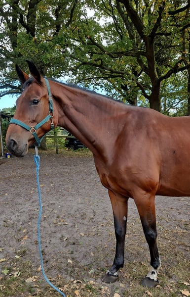 For sale is this 6-year-old KWPN mare "Ominka-Star". She is sired by Pommerol de Muze (Emerald van’t Ruytershof x Kannan) out of a dam by Zapatero VDL x Cantos. She is a very typy mare, standing at approximately 171 cm and has excellent coverage. Ominka had a foal last year and was only started under saddle this year. She moves well in all three basic gaits in the arena and is comfortable both alone and in a group in the field, having already made her first jumps under the rider. She is very easy to ride in contact and has plenty of energy. She is eager to learn and always strives to do everything right. In free jumping, she impresses with great bascule and quick reflexes. Ominka is an absolute gem to handle: her calm, relaxed, and affectionate nature makes her a perfect horse for amateurs! Of course, she is well-behaved for the farrier and loading, is barefoot, has had her teeth done, and has already been X-rayed. Currently, she is in a mixed herd in a paddock, but is also familiar with box stabling. She holds a middle rank within the herd. Now, she is looking for the right home where she can go through thick and thin with her new owner. Please only contact if you are seriously interested; due to the absence of the actual rider, a straightforward transaction is preferred. Trial rides can be arranged at any time, for which a fee of €30 will be charged to protect against riding tourism. For further information, please contact ONLY at 016095972290, no WhatsApp or messages!