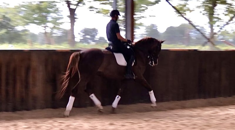Ta 6-letnia klacz ma dobry chód i bardzo dobry galop. Zachowuje się grzecznie w codziennym kontakcie, podczas załadunku i u kowala. Przechodzi trening zmian.