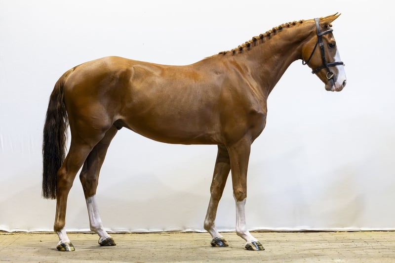 Beautiful chestnut gelding with a lot of presence and quality. Light-footed with a good jumping technique and good overview on the jump. Takes off well and is easy to ride. Ready to jump a training course. Sire Newmarket VM – 1.45m level. Son of Chacoon Blue (1.50m) from the line of Chacco-Blue (1.60m), known for scope, reflexes and modern sport quality. Dam Celin v Veecaten – 1.10m level, daughter of Ukato (1.60m). Damline From a strong performance family: Kroon v Veecaten – 1.55m Mijn Heer voor Veecaten – 1.40m Neeltje v Veecaten – 1.35m Second generation: Baron – 1.55m Chef v Veecaten – 1.55m Mats van Veecaten – 1.45m Noa van Veecaten – 1.35m Further in the line: Valine van Veecaten – 1.60m Strong international sport line with multiple horses at 1.40m–1.60m level.