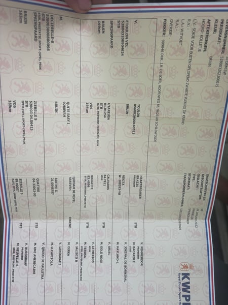 ¡Hermoso potro joven de KWPN en venta! 🇳🇱✨ Se ofrece un potro de 4 años, con una altura de 1,75 m, imponente y ya montado. Posee movimientos excelentes, una apariencia elegante y una estructura atlética, ¡una verdadera conformación de caballo de deporte! 💪 📝 Pedigrí: ✨ Padre: Etoulon VDL (Toulon x Calvados) – una línea de salto famosa, reconocida por su talento excepcional, fuerza y técnica. ✨ Madre: Deceibelle-S (Quasimodo van de Molendreef x Quidam de Revel) – proviene de una destacada familia de caballos de deporte, de la cual han salido varios caballos de carreras exitosos. El caballo es tranquilo, cooperativo, fácil de montar y manejar, además de ser muy dócil y atento. Se le realiza cuidado diario, está vacunado y desparasitado regularmente, goza de buena salud y tiene buenos hábitos. Es una opción ideal para disciplinas deportivas (salto o doma), pero debido a sus movimientos elegantes y su carácter equilibrado, también es perfecto como caballo de ocio. 🏇