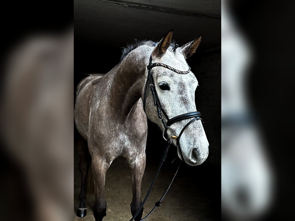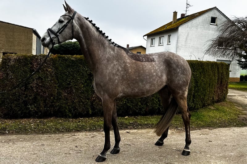 Zum Verkauf steht ein bildschöner, 6-jähriger KWPN-Wallach, der durch seine sportliche Gesamterscheinung und eine erstklassige Abstammung besticht. Mit Hickstead White und Romanov Blue Hors vereint dieser Apfelschimmel feinste Leistungsgenetik und bringt alle Voraussetzungen für eine erfolgreiche Zukunft im Sport mit. Er wurde erst spät angeritten und daher sehr schonend aufgebaut, weshalb er sich aktuell noch am Anfang seiner weiteren Ausbildung befindet. Der Wallach verfügt über drei überdurchschnittliche Grundgangarten mit viel Takt und Elastizität. Im täglichen Umgang sowie unter dem Sattel zeigt er sich stets ehrlich, vorsichtig und dem Menschen gegenüber zugewandt. Er ist absolut frei von Unarten wie Steigen oder Bocken. Als feinfühliges Pferd präsentiert er sich aufmerksam gegenüber seiner Umwelt, bleibt dabei jedoch stets händelbar. Er sucht einen souveränen Reiter, der ihm die nötige Sicherheit gibt, um sein volles Potenzial abzurufen. Seine Doppelveranlagung macht ihn zu einer vielseitigen Offerte für den ambitionierten Reiter. Hervorzuheben ist auch sein Talent am Sprung, das er im Freispringen mit viel Übersicht, schneller Reaktion und Vermögen unter Beweis stellt. Röntgenbilder liegen vor. Dieser charmante Youngster ist eine ideale Gelegenheit für Reiter, die ein qualitätsvolles Nachwuchspferd zur weiteren Ausbildung suchen. Bei Interesse melden Sie sich gerne telefonisch unter: +49 172 69 42 581
