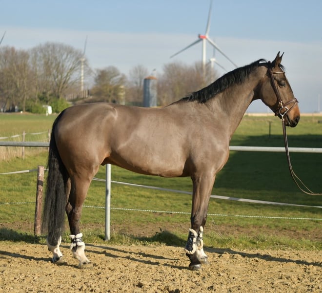 Impressive Show Jumping Horse Perley JRV For sale is an outstanding show jumper standing at an impressive 1.87 meters, renowned for its high quality and exceptional jumping ability. This talented horse has already competed successfully in competitions and consistently demonstrates calmness and reliability under saddle. We are confident that he could also excel as a vaulting horse, although he has no prior experience in this discipline. He is well-trained in dressage and shows his full potential in free jumping—easily and elegantly clearing jumps up to 1.55 meters. **Pedigree:** His lineage speaks for itself: Through sire Grandorado TN and dam sire Indoctro, he boasts a top-class pedigree that is reflected in his performance. ### **Special Offer:** Immediate purchase entitles you to a 5% discount on the sale price! ### **Test Opportunity:** Take advantage of the chance to test this exceptional horse for one week. The trial week can be supervised by experienced trainers, and you have the option to combine lessons with testing. Please note that this trial is subject to a fee, which will not be deducted from the purchase price. ### **Trial Riding:** We invite you to get to know the horse in person. The cost for a pre-ride or trial ride is €30 per person. Don’t miss this opportunity! This horse could become your new partner in sport. Contact us for more information and to schedule an appointment.