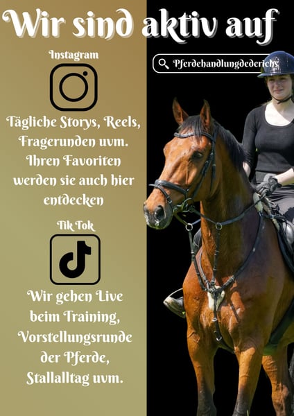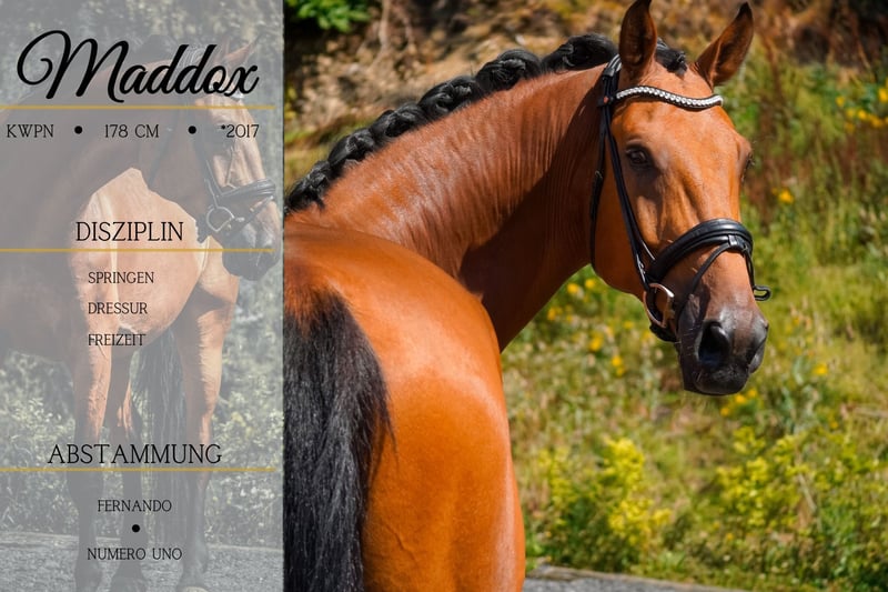 Maddox ist ein 2017 geborener KWPN Wallach ca. 176 cm v. Fernando, For Pleasure, Corrado I x Numero Uno, Ramiro Z, Landgraf *Maddox* bildschöner Wallach mit schönen Bewegungen. Maddox ist dieses Jahr bis 110 im Springen platziert und ein richtiger Allrounder. In der Dressurarbeit zeigt er sich rittig und ist mit einem ruhigen Temperament ausgestattet !!! SCHAUEN SIE SICH UNBEDINGT SEIN VIDEO AN !!! Im Umgang verschmust und super Menschenbezogen. Er bringt eine große gute AKU bereits mit. Ein aktuelles Video finden Sie hier in der Anzeige oder unter folgendem Link: https://www.youtube.com/watch?v=lKUa54AtwGQ Pferdehandlung Dederichs – Ihr Partner für den Pferdekauf Kontakt & Erreichbarkeit: Anfragen bitte ausschließlich telefonisch unter 0173/9792139 Montag – Freitag: 09:00 – 18:00 Uhr Samstag: 09:00 – 15:00 Uhr Sonntag: Ruhetag Folgen Sie uns auf Social Media! Erleben Sie unseren Alltag mit den Verkaufspferden auf Instagram, TikTok & Facebook unter Pferdehandlung Dederichs Rabatt: Bei sofortiger Mitnahme Ihres neuen Traumpferdes erhalten Sie zwischen 5 %– 10 % Rabatt Probereiten & Vorführen: • Probereiten: 30 € pro Pferd (max. 2 Reiter), Betrag wird beim Kauf angerechnet • Feiertage: Proberitt 50 € • Vorführung durch unsere Bereiter: 25 € pro Pferd (Vorreiten, Bodenarbeit etc.) Ankaufsuntersuchung & Transport: • Viele unserer Pferde besitzen bereits eine AKU • Sie können selbstverständlich Ihren eigenen Tierarzt mitbringen • Gerne organisieren wir eine Untersuchung • Wir unterstützen Sie auch gerne beim Transport ins neue Zuhause Weitere Verkaufspferde: In unserem Stall stehen weitere Verkaufspferde, die noch nicht online sind. Falls Ihr Traumpferd noch nicht dabei ist, zögern Sie nicht, uns zu kontaktieren. Wichtige Hinweise: • Stockmaß-Angaben sind geschätzt und nicht exakt nachgemessen • Alle Beschreibungen sind subjektive Einschätzungen des Verkäufers und keine zugesicherten Eigenschaften Weitere Informationen finden Sie unter: www.Pferdehandlung-Dederichs.de