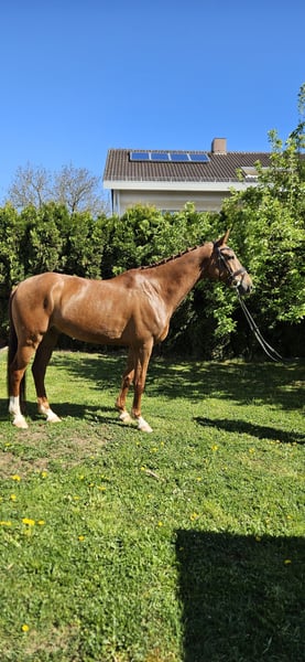 Zum Verkauf steht ein ausgesprochen typvoller KWPN-Wallach, Jahrgang 2016. Mit seinem edlen Fuchsfell und einem harmonischen Stockmaß von 166 cm zieht er im Viereck wie auch im Alltag alle Blicke auf sich. Dieser talentierte Dressurpartner überzeugt durch sein ausgeglichenes Temperament, seine hohe Lernbereitschaft und eine tolle Bewegungsqualität. Er ist solide in allen drei Sparten ausgebildet. Er kann Seig und Platzierungen bis zur Dressur Klasse L vorweisen und auch im Springen und der Vielseitigkeit war er mehrfach platziert bis zur Klasse A. Er lässt sich auch von Jugendlichen gut reiten und kann den Weg in den Turniersport öffnen. Im täglichen Umgang zeigt er sich zuverlässig, freundlich und stets kooperativ. Er ist schmiede und verladefromm. Er war bis jetzt immer gesund und ist bereit seinen neuen Besitzern sowohl Zuhause und auch auf Turnieren zu begleiten und zu begeistern. Bei Interesse oder Fragen freue ich mich über eine Nachricht. Ein persönliches Kennenlernen kann gern nach Absprache vereinbart werden Tel. 017624832026.