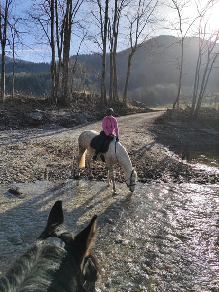 Ich suche für meine 12-jährige Leonharder-Stute Candis (F2) ein neues, passendes Zuhause. Der Leonharder ist eine noch sehr junge bayerische Pferderasse, die hauptsächlich für die Stutenmilchproduktion gezüchtet wird. In der ersten Generation wird der Haflinger (25%) mit dem Welsh-Pony (25%) gekreuzt. Diese Nachkommen werden danach mit PREs (50%) gekreuzt. 2011 wurde die Rasse amtlich zugelassen. Candis braucht eine souveräne und erfahrene Person, die ruhig, konsequent und klar in ihrer Körpersprache ist. Da ich durch meine neue Lebensaufgabe als Mama von zwei kleinen Kindern nicht mehr die Zeit und Energie habe, ihr gerecht zu werden, habe ich mich schweren Herzens entschieden, sie abzugeben. Candis ist eine charakterstarke Stute, die eine sichere Führung und klare Grenzen benötigt, um sich wohlzufühlen. Fehlen diese, kann es beim Führen oder im Umgang zu Unsicherheiten kommen. Ich habe Candis im Alter von vier Jahren übernommen, und in den letzten acht Jahren haben wir gemeinsam viel erreicht. Sie war ein Familienpferd – egal ob bei Ausritten, Spaziergängen mit Kinderwagen, Training auf anderen Anlagen oder im täglichen Umgang. Auch ein 13-jähriges Mädchen ist sie in den letzten drei Jahren regelmäßig geritten. Candis hat ein Stockmaß von ca. 1,50 m, ist regelmäßig geimpft, entwurmt und steht vierfach beschlagen beim Hufschmied. Derzeit lebt sie in Boxenhaltung mit täglichem Koppelgang. Sie ist herdenverträglich, sowohl in gemischten als auch in reinen Stutenherden, zeigt aber gelegentlich ein dominantes Verhalten gegenüber anderen Pferden. Candis ist in der E-Dressur platziert und wurde auch E gesprungen. Sie kann bereits ein paar Lektionen bis M. Im Gelände ist sie – mit sicherem Reiter – sowohl alleine als auch in der Gruppe angenehm zu reiten. Zum Verkauf gehört ihr passender brauner Prestige Monoblatt D1 K Sattel (17 Zoll), ein Zaumzeug sowie weiteres Zubehör. Ich freue mich über Nachrichten von Interessenten, die mir ein wenig über sich und das zukünftige Zuhause von Candis erzählen. Genauere Informationen und Videos stelle ich selbstverständlich gerne bei ernsthaftem Interesse nach Privatkontakt zur Verfügung.