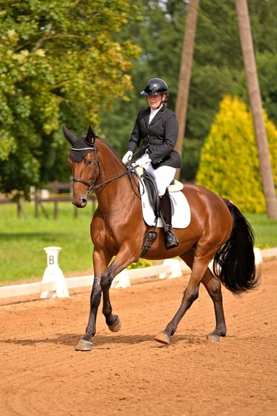 Vaccines, dental and farrier work up to date. Regular physio checks done. No behavioural problems with farriers and vets. Competition experience in low level dressage. Behaves calm in competitions and hacks. Has started jumping at home. Good gaits and jump. Suitable for experienced amateur. Has had one foal through artificial insemination. Ask for xrays.