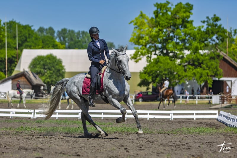 Nikkel is a kind, well-mannered Lipizzaner gelding, completely free of any malice. He is a refined and sensitive horse, therefore not recommended for beginners. He has been trained by me since the age of three, following the principles of the French classical school. He competed in Working Equitation up to L level and performs all lateral movements in all three gaits with ease. In groundwork (Parelli, liberty), he is well-educated — he can rear on command, is learning the Spanish walk, and performs shoulder-in, haunches-in, and halfpass from the ground. He would make a perfect partner for a dedicated leisure rider, Working Equitation competitor, or classical dressage enthusiast. Nikkel is easy to handle, gets along well with other horses, and always avoids conflict. Currently kept in semi-pasture turnout with three companions. Front shoes on; vaccinations and blood tests are up to date.