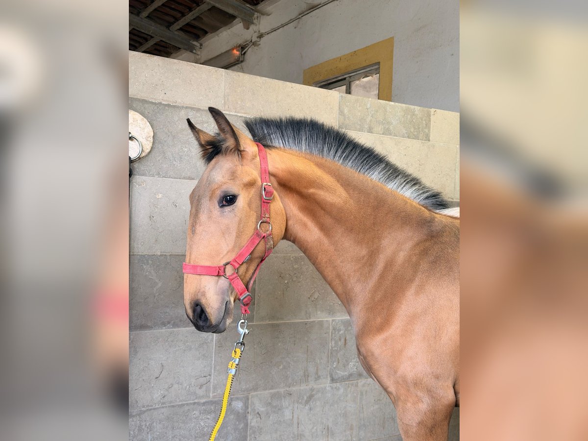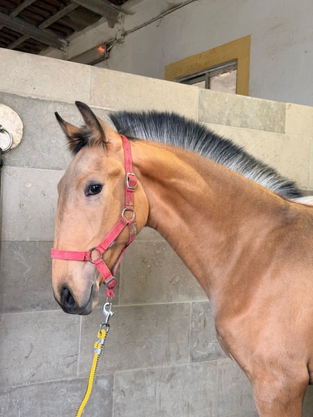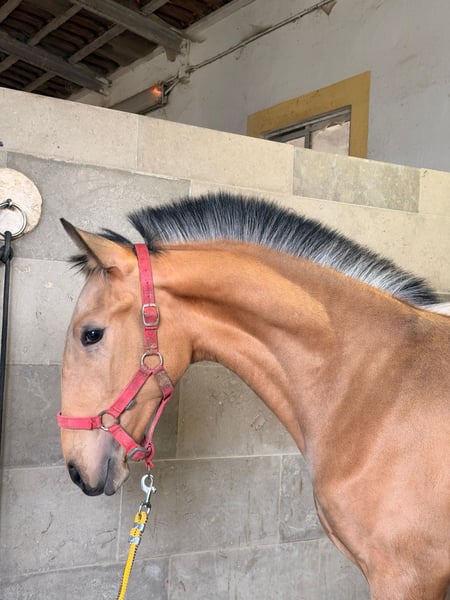 ✨VENTIL DE SENA✨ Buckskin with RUBI and HOSTIL lineage & promising sporting potential VENTIL DE SENA Features: - Breed: Lusitano - Sex: Stallion - Year of Birth: 2025 - Color: Buckskin - Height: approximately 16.1 hh (estimated final height) ⸻ An exceptionally typy Lusitano colt, impressing with his sought-after buckskin color, strong pedigree, and friendly character. A young horse with genuine potential – suitable for sport, breeding, and discerning Lusitano enthusiasts. ⸻ 🧬 High-quality pedigree: ✨ Sire: HOSTIL DE SENA • Approved with 70.5 points • Represents rideability, substance, and willingness to perform ✨ Dam: NERUDA DE SENA • Approved with 71.51 points • Descended from the renowned RUBI, one of the most influential Lusitano sires in international dressage ➡️ A genetic combination of athleticism, quality, and proven bloodlines. ⸻ 🐎 Movement & quality: • Very elegant, elastic basic gaits • Expressive movement pattern • Good natural balance ➡️ VENTIL already demonstrates power, elasticity, and presence – excellent prerequisites for a future sporting career. ⸻ 🧠 Character & development: • Knows the basics of foal training • Loving, friendly, and human-oriented • Clear-minded and attentive ➡️ A young stallion with an honest, pleasant nature and a very good attitude. ⸻ 🌿 Rearing: VENTIL is raised appropriately, allowing him to develop calmly – an ideal foundation for a healthy, capable sport horse. ⸻ 🎯 Future prospects: VENTIL DE SENA is ideal for: • Future dressage or working equitation disciplines • Breeding enthusiasts due to his high-quality bloodlines • Lovers of exceptional Lusitanos with color and quality ⸻ ⭐ Summary: VENTIL DE SENA combines: ✅ Buckskin special color ✅ RUBI bloodline ✅ Approved parents ✅ Excellent movement ✅ Loving, clear character ➡️ A young horse for those seeking something special and wishing to raise a Lusitano foal with real potential. ⸻ 📞 Contact & Viewing VENTIL DE SENA can be visited by appointment. I look forward to serious inquiries and am happy to take time for a personal conversation.