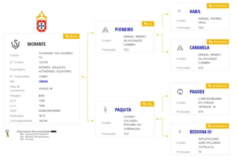 Lusitano veulen met bijzondere genetica, zoon van Morante SS, drievoudig wereldkampioen in de werkpaardensport. Ook kleinzoon van Pioneiro, die vele dressuurpaarden heeft voortgebracht, waaronder Importante II van Rafael Soto. Spectaculaire bouw, veelbelovend voor zowel dressuur als werkpaardensport.