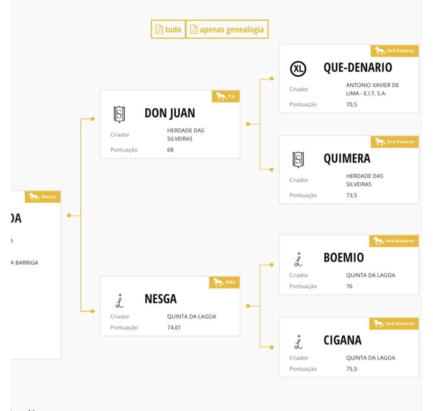 Puledro di 3 anni e mezzo, figlio di Don Juan. È stato un po' montato alla corda, molto gentile. È fratello del padre di Optimus, campione di doma in Portogallo tra i 4 e i 7 anni, e anche di Nadal, recente campione U25 a livello Gran Premio. Un puledro con grandi movimenti, nobiltà, forza e buona testa. Discendente di Opus72, proviene anche dalle migliori linee di Coimbra RX OK disponibili. Nelle ultime due foto i suoi fratelli campioni.