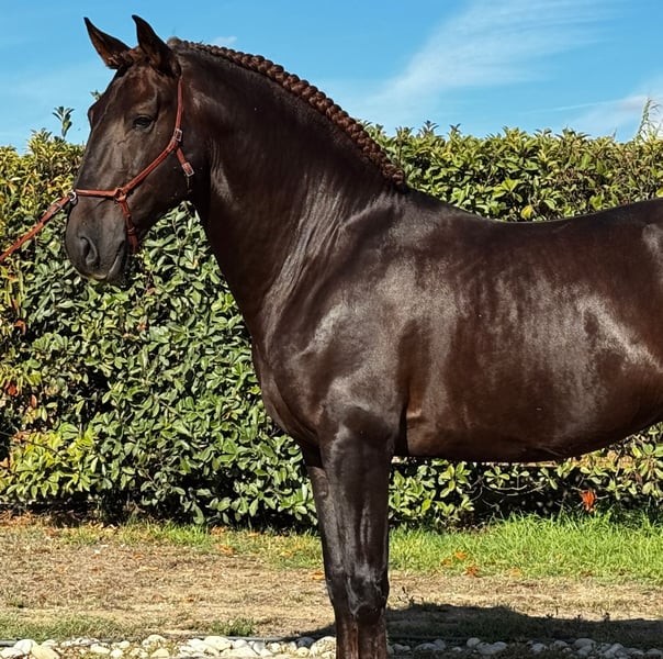 Een zeer zeldzame leverkleurige Lusitano 🥰 Obelix is een 7-jarige goedgekeurde barokke Lusitano hengst, 170 cm hoog en piro-negatief. Ik denk dat hij de enige Lusitano hengst met deze kleur en grootte is. Obelix is net als zijn naamgenoot uit de beroemde films een heel zachtaardig en lief reusachtig paard met een groot hart, veel geduld en liefde. Hij is goed getraind en voert vliegende wissels uit, kan piaffe en passage beginnen, en doet zijwaartse oefeningen. Piaffe wordt handmatig aangezet en passage is ook gestart. Hij kan ook groot draven. Hij is geschikt voor elk type ruiter. Een 13-jarig meisje kan hem rijden in Golegã, zelfs in een zeer stressvolle situatie met merrie’s en andere hengsten, en hij is veilig. Dit paard is een levensverzekering. Zowel amateur- als professionele ruiters zullen genieten van deze paard, omdat hij goede gangen heeft en perfect zou zijn voor de dressuurring. Zijn kleur is erg bijzonder. Sommige delen van zijn benen zijn lichter, en zijn manen glanzen in een lichtrood tintje als hij in de zomer open is. Nu in de winter wordt hij ebonzwart. Hij heeft een lange manen en veel haar in het algemeen 😊 Obelix is goedgekeurd voor de fokkerij en piro-negatief getest. Hij is iets heel bijzonders! Gevestigd in Portugal 🇵🇹 Meer informatie via PM of WhatsApp +49 1786 997334. Jasmin van Top-Lusitanos 🤗