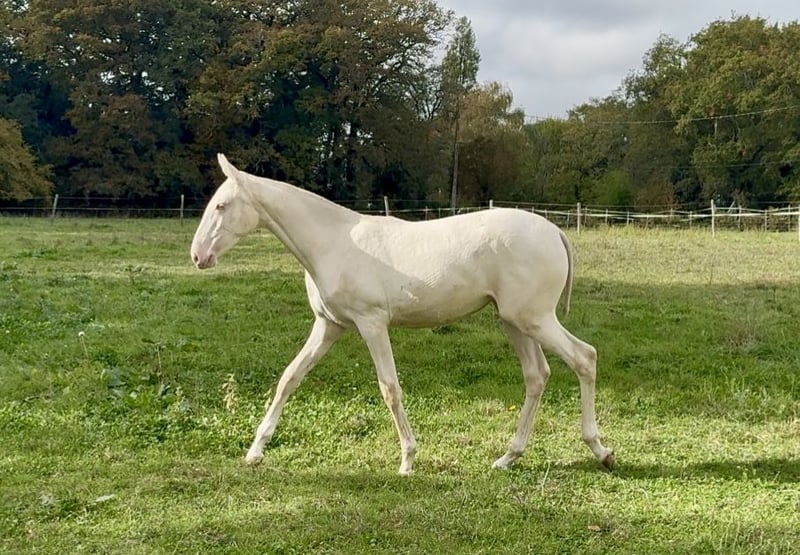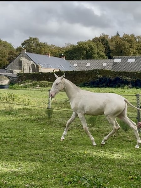✨ Parce qu’on ne peut malheureusement pas garder tout le monde… ✨ Nous mettons en vente V-Pearl, magnifique pouliche crème aux yeux bleus, née en mars 2025. Fille de Nopal et Mariolas d’Al Baizir, V-Pearl promet beaucoup : un modèle harmonieux, une belle prestance et un tempérament curieux et proche de l’homme. Elle vit au pré avec d’autres chevaux, manipulée, à jour de tout (papiers, puce, vermifuge, etc.). Elle fait déjà plus d’1m35. MP pour plus de renseignements 📍Visible à Guérande 💛 Couleur rare