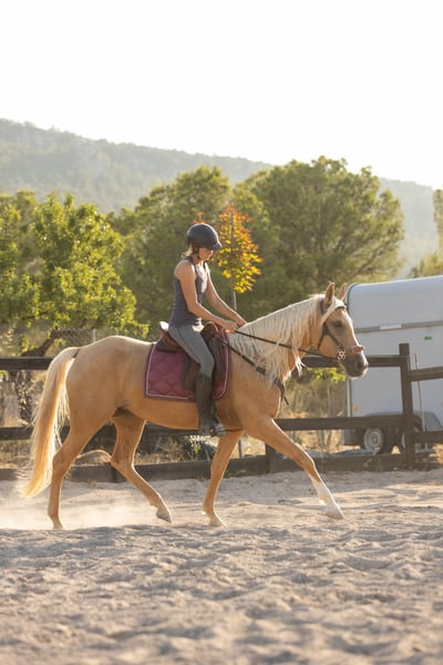 TRIANA – Yegua Hispanoárabe x Lusitano – Palomino – 5 años Preciosa yegua joven de gran calidad, con belleza, excelente genética y carácter equilibrado. Ideal para quien busque un caballo para disfrutar con respeto y conexión. Raza: Hispanoárabe x Lusitano – hija de yegua Lusitana y del reconocido Tapete YM (Yeguada Militar). Registro: Inscrita en ANCADES – Caballo de Deporte Español. Nacimiento: Febrero 2021 (5 años) Altura: 1,63 m Capa: Palomino Señas: Lucero en la cara y un calcetín en una pata trasera Triana comenzó su doma y entrenamiento en abril de 2025, siguiendo un método respetuoso y progresivo, centrado en su desarrollo físico y mental. Trabajo en libertad: Conoce ejercicios como tumbarse a la orden, seguir, pasos atrás, apoyos, quedarse quieta y acudir a la llamada. Domada a la voz, lo que facilita la comunicación y el trabajo diario. Entrenamiento físico: Trabajo de cuerpo entero con foco en propiocepción, desarrollo muscular y equilibrio. Disfruta de terrenos irregulares, subidas y bajadas, y en pista se trabaja la correcta utilización de grupa, dorso y posteriores. Trabajo montado: Paso, trote y galope; sale al exterior sola o en compañía. Experiencia en exterior: Ha participado en su primera aventura en El Rocío, viaje largo en camión con otros caballos y estancia de una semana en la aldea. Comportamiento ejemplar en un entorno lleno de carruajes, jinetes y estímulos variados. Habituada a todo tipo de estímulos: camiones, tractores, carruajes, vacas, ovejas, perros y ciclistas. Montura: Bitless (sin bocado), aunque también conoce el bocado. Siempre dispuesta a aprender, cariñosa y cercana a las personas. IMPORTANTE – Salud y manejo Descalza (barefoot), nunca ha llevado herraduras. Cascos adaptados a terrenos duros y piedras, recortados cada 6 semanas. Excelente comportamiento con el podólogo equino. Dientes: A principios de 2025 recibió revisión completa y limado de dientes por dentista equino. Osteopatía: Varias sesiones realizadas para mantenimiento y bienestar. Salud: Excelente, vacunada y desparasitada. Vive en manada mixta, con refugio disponible y libertad de movimiento todo el día. Alimentación basada en heno de pradera 24/7, alfalfa, cereales y mash de hierbas St. Hippolyt. Buscamos: Persona sensible, cercana y comprometida, que quiera seguir aprendiendo y creciendo junto a Triana. 📍 Más información, fotos y vídeos disponibles bajo solicitud.