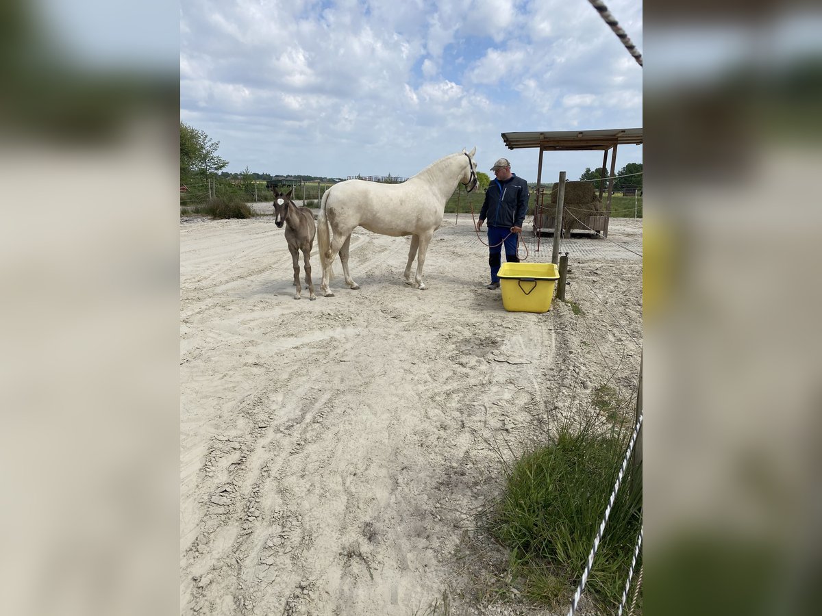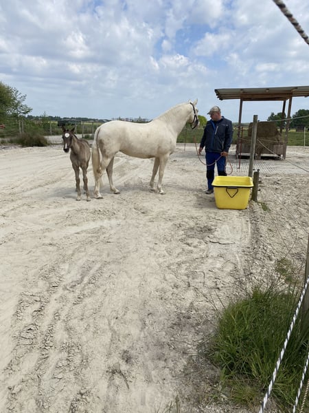 Beautiful Lusitano broodmare in Pearl color available due to retirement from breeding. Our “Queri” – Querida Da Toula – has lovingly cared for her foal this year. Now, she is seeking her new home. She passively passes on her exceptional black pearl color as a dominant trait. Queri was foaled in April 2020 and has not yet been backed. We can very well imagine her continuing her career as a broodmare. However, she also has the potential to be a partner for leisure and sport. She is familiar with halter and longe, and is both ground and loading trained. She has been regularly dewormed and examined by the veterinarian. Currently, she is together with her foal “Venus,” and both can be purchased as a package at a special price. The listed price applies to the mare. As long as the ads are online, the horses are still available. If you are interested, we look forward to your message or call!