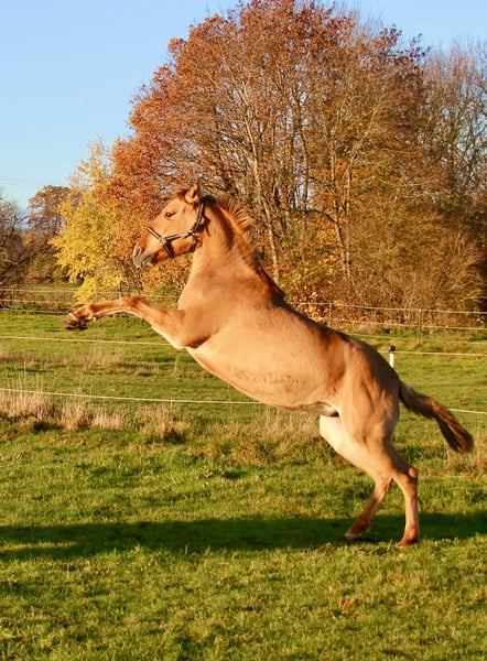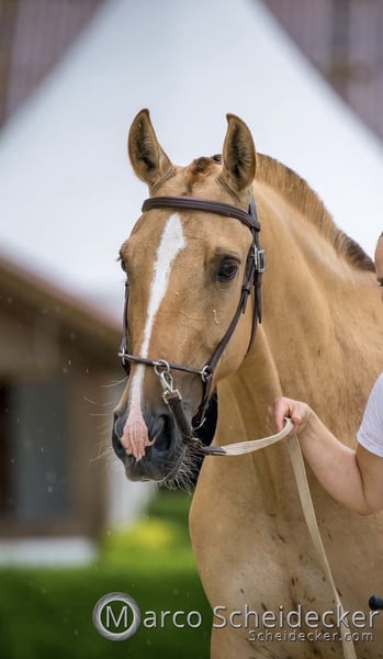 Quā urodzona 10.05.2020 Wysokość: 1,52 m Czerwony dąb Ten kolor jest bardzo rzadki w hodowli Lusitano. Gen Dun jest genetycznym czynnikiem rozjaśniającym u koni, który rozjaśnia umaszczenie i jednocześnie wywołuje charakterystyczne dzikie oznaczenia, takie jak ciemny pas wzdłuż grzbietu, paski zebra na nogach oraz znak na ramieniu. W języku niemieckim kolor ten nazywa się "Rotfalbe". Quā od dwóch lat jest z nami, bezpośrednio od swojego hodowcy. Wychowała się w stadzie i również u nas przebywa w grupie. Latem 24 godziny na pastwisku, zimą w wolnym boksie z dostępem do wybiegu. Zna również klatkę. W wieku 4 lat była przez 3 miesiące przygotowywana do jazdy. Bardzo powoli i z dużym zrozumieniem koni, przyzwyczailiśmy ją do jazdy. Od tego czasu nie była już jeźdzona, ponieważ została zapłodniona i w 2025 roku urodzi swoje pierwsze źrebię! Podczas przygotowań do jazdy zachowywała się poprawnie i była łagodna. Uwielbia, gdy się z nią zajmuje. To właśnie dlatego oferuję ją na sprzedaż – u nas czuje się znudzona w stadzie z innymi klaczami hodowlanymi. Chciałaby więcej pracy. Jest bardzo przywiązana do ludzi. Zna załadunek, wsiada chętnie, jest spokojna podczas jazdy. Zgodnie z zasadami, jest spokojna przy czyszczeniu kopyt. Regularnie odrobaczana i karmiona mineralnym pokarmem. Nie jest odpowiednia dla początkujących, ponieważ nadal nie jest rutynowym koniem do jazdy. To nie jest sprzedaż w nagłej potrzebie! Quā trafi tylko do odpowiedniej osoby. W razie pytań, proszę o telefon. Lusitano-via-Claudia.de