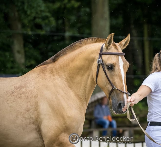 Quā Geboren op 10-05-2020 1,52 m Red dun Deze kleur is zeer zeldzaam binnen de Lusitano fokkerij. Het dun-gen is een genetische ophelderingsfactor bij paarden die de vachtkleur verdunt en tegelijkertijd zogenaamde wildtekeningen zoals een donkere aalstreep, zebra-achtige strepen op de benen en een schoudervlek zichtbaar maken. In het Duits wordt deze kleur ook wel "roodfalbe" genoemd. Quā kwam op de leeftijd van 2 jaar rechtstreeks van haar fokker naar ons. Ze is opgegroeid in een kudde en staat ook bij ons in een kudde. In de zomer 24 uur op de wei en in de winter in een open stal met wei. Ze kent ook de box. Op 4-jarige leeftijd is ze drie maanden lang begonnen met rijden. Zeer rustig en met veel paardenverstand werd ze aan het rijden gewend. Sindsdien is ze niet meer gereden, omdat ze toen gedekt werd en in 2025 haar eerste veulen krijgt! Tijdens het inrijden was ze netjes en lief. Ze vindt het heerlijk om bezig gehouden te worden. Dit is ook de reden waarom ik haar te koop aanbied, want bij ons wordt ze ondergewaardeerd in vergelijking met de andere fokmerries op de wei. Ze wil graag meer werken. Ze is zeer mensgericht. Ze kent het laden in de trailer, stapt er goed in en gedraagt zich braaf tijdens het rijden. Ze is braaf bij het knippen van de hoeven. Ze is regelmatig ontwormd en krijgt mineralenvoer. Ze is niet geschikt voor beginners, omdat ze nog geen routinematig rijpaard is. Dit is geen dringende verkoop! Quā gaat alleen naar een passende eigenaar. Bij vragen, bel gerust. Lusitano-via-Claudia.de