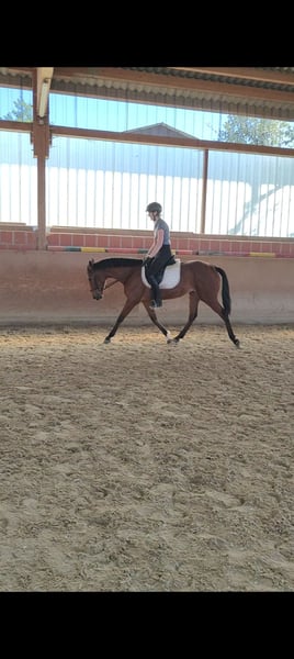 Cette jeune jument Lusitano-mixte séduit par son caractère affectueux, sincère et sensible. Mesurant actuellement environ 1,55 m, elle est encore en croissance et évolue vers une jument harmonieuse, expressive et pleine de charme. Elle est très lucide, patiente et équilibrée, établit rapidement la confiance et se montre toujours attentive et amicale dans son comportement quotidien. Sous la selle, elle se présente avec des allures de base régulières, marche déjà solidement en dressage et accepte bien la morsure. Elle travaille avec diligence, envie d'apprendre et beaucoup de sensibilité. En extérieur, elle fait preuve de calme, de sûreté et d'audace, aussi bien seule qu'en groupe. Grâce à sa sensibilité et sa tranquillité, elle convient également parfaitement au travail assisté par l'animal ou à la pédagogie équestre. Elle possède aussi d'excellentes aptitudes pour la dressage et la Working Equitation – une jument douce, intelligente, avec du cœur et un bel avenir. Cuaresma t'a séduite ? Je serai ravie de recevoir ton appel ou ton message ! Pour mieux connaître ton cheval de rêve, n'hésite pas à prendre ton temps et à passer une nuit dans notre belle région du lac d’Eder, afin de combiner ton voyage avec un petit séjour. La rencontre et l’essayage du cheval coûtent 50 € par jour et par cheval, qui seront déduits en cas d’achat. Ton cheval idéal ne figure pas dans mes annonces ? Je me ferai un plaisir de le trouver pour toi ! Plus d’informations sur www.deinspanischespferd.de. J’ai hâte de te rencontrer !