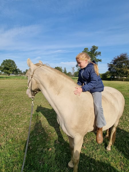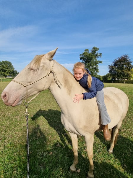 Prachtige cremello merrie met blauwe ogen. Ontzettend lief en knuffelig. Kan zowel normaal als western gereden worden. Wordt hier nu western gereden. Tevens geschikt als fokmerrie. Is gevoelig aan de hulpen en kan goed gereden worden met touwhalster. Ze is goed voorwaarts een reageert ook goed op de rem. Ze is nu 1,5 jaar onder het zadel en nog wel wat groen. Ze is leergierig en pakt onwijs snel dingen op. Ze vind het leuk om te werken en wil het graag goed doen. Ze is slim, gevoelig en dapper. Ze is met wandelen gewend aan verkeer. We wonen aan en drukke weg. Ze is ontzettend braaf met de hoefjes, deze worden natuurlijk bekapd. Ook de trailer is geen probleem. Ze staat hier 24/7 buiten in een kleine kudde en krijgt alleen ruwvoer. Ze moet helaas met spoed weg ivm ruimte tekort, vandaar de lage prijs!