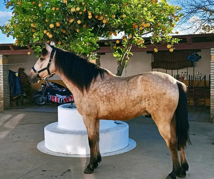 Apolo is a very alert, small, and compact horse with a beautiful coat color. He is very attentive, clever, but can sometimes be a bit stubborn. Once he has built trust in you, he becomes affectionate, eager to learn, and very cuddly. He is barefoot and moves without any issues. He is free of skin conditions and is a very hardy young horse. Most of his work has been done on the ground. He is also backed and responds very delicately to aids, demonstrating a strong forward drive. Apolo is definitely not suitable for beginners; he requires a sensitive, clear, and consistent handler, as well as balanced and regular activity. In the herd, he often appears somewhat insecure and tends to be lower in the hierarchy. Apolo lives on a finca in Jerez de la Frontera, managed by my Swiss friend. He is well cared for there, regularly worked on the ground, and occasionally ridden. My young horse will only be sold to a very good home. For questions, please contact me at +41 79 416 79 13, Silvia Kaufmann.