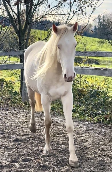 Ein besonderes Pferd, das man nicht sucht – sondern findet. Unser "Jogi" ist ein reinrassiger Pura Sangre Lusitano mit blauen Augen und blauem Buch und stammt aus einer erstklassigen Zucht in Spanien. Mit 3 Jahren vereint er alles, was man sich von einem besonderen Pferd wünscht. Jaguar ist kastriert und ein echtes Gute-Laune-Pferd – freundlich, menschenbezogen und dabei außergewöhnlich klar im Kopf. Seine fröhliche und dennoch ruhige, ausgeglichene Art macht ihn zu einem Partner, dem man sofort vertraut. Lieb im Umgang, völlig unkompliziert, ehrlich im Wesen und mit einer natürlichen Präsenz, die berührt. Aufgewachsen in der Herde, in der freien Natur geboren, durfte Jaguar genau so Pferd sein, wie es für Körper und Seele richtig ist. In der weiten Landschaft der Extremadura in Spanien hat er starke Nerven, gesunde Bewegung und soziale Intelligenz entwickelt – beste Voraussetzungen für ein gesundes, ausgeglichenes und starkes Pferd. Er bringt nicht nur hervorragende Gene mit, sondern auch Charakter, Freude und innere Ruhe. Jaguar ist ein Herzenspferd. 1,5 jährig kam er von Spanien zu uns nach Bayern. Wir haben ihn zusammen mit seinem Halbbruder gekauft, von Anfang an mit der Voraussetzung, dass wir ihn wieder verkaufen, wenn wir seinen Menschen gefunden haben. Bisher haben wir diesen Schritt so gut es geht verdrängt. Er hat nie etwas falsch gemacht, er ist ein wahnsinnig tolles Pferd und wir werden sehr traurig sein, wenn er in sein neues Zuhause umzieht. Bis jetzt ist er mit unseren Jungs mitgesaust, ist sehr sozial und gut verträglich. Er kann alles, was ein 3-jähriger können sollte (longieren, Bodenarbeit, Hänger, Schmied). Er hat super Hufe und läuft Barhuf. Er ist wunderschön, hat eine besondere Aura und seine Mähne wächst täglich! Da wir etwas bekannter sind und nicht unterscheiden können, wer es ernst meint und wer nur einen Sonntagsausflug zu uns machen möchte, verlangen wir eine "Schutzgebühr" von 250€ die beim Kauf wieder angerechnet wird. Gerne schicken wir auch ein Video, das liess sich hier nicht hochladen anschreiben unter Whatsapp 004915228557720! Wir bitten um Dein Verständnis und freuen uns auf Dich!!