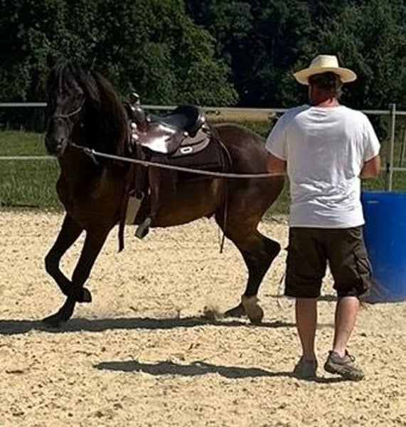 Traumhaft schöner und ausdrucksstarker Lusitano Wallach. Mit seinen 5 Jahren ist er schon ein Kraftpaket und weiss zu beeindrucken. Kompakt, wendig und stark aus der Hinterhand zeigt er dass viel Potential vorhanden ist. Selbstbewusst und eher in Hengstmanier kommt er gut alleine klar, seine Position will er akzeptiert und geschätzt wissen, geht aber mit konsequenter und klarer Führung gut um. Er wird zur Zeit in allen GGA angeritten und erstaunt unter dem Sattel mit seiner vorsichtigen und feinen Art. In der Natur spazieren, vom Boden aus arbeiten, verladen oder auch Hindernissetraining absolviert er schon sehr gut und willig, zeigt auch dass er Bewegung und Abwechslung liebt. Maron gehört in erfahrene und sanfte Hände mit Ambitionen, er ist kein Pferd für Anfänger oder reine Freizeitreiter. Auch ist er nicht geeignet für eine Offenstallhaltung, braucht aber sicher eine Aussenboxe und viel Auslauf.