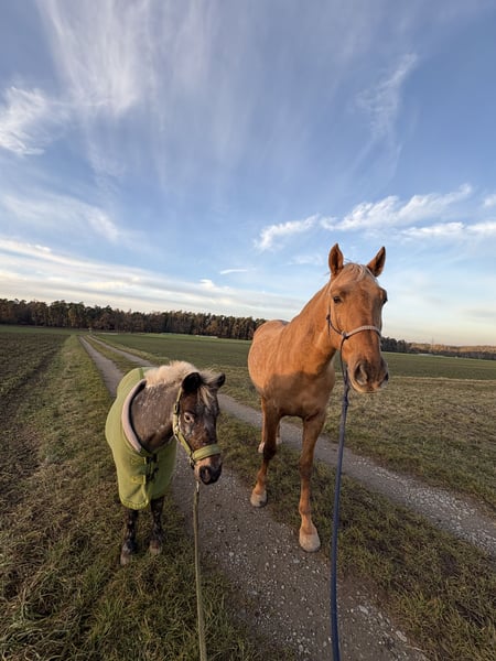 Con mucho pesar, tenemos que despedirnos de nuestro Nuestro. Nuestro tiene 4 años, mide un poco más de 1,70 m y es un caballo lusitano. Está sin herrar y, en cuanto a carácter, es un pequeño travieso. En el manejo, es un verdadero tesoro. No tiene malos hábitos, es algo sensible, pero totalmente valiente. Permite que le hagan todo: cepillado, herraduras, ducha, guía, paseos, trabajo con el herrador y carga sin problema alguno. Bajo la montura, camina tranquilamente en todos los gaits. También está acostumbrado a pasear en pareja, y en mano va muy bien. Actualmente, es montado por una niña de 10 años tanto en el paddock como en el campo, y siempre la cuida muy bien, por lo que también podemos imaginarlo como un caballo para niños o para un tándem madre-hijo. Sin embargo, no es apto como caballo exclusivamente infantil o para principiantes, ya que su entrenamiento aún está en marcha. La base ya está sentada; ahora puede comenzar la verdadera formación de Nui. Ideal para personas que disfrutan de la autoformación. Nui fue un caballo con respiración por el cuello, pero en noviembre fue sometido a una operación. En 2026, retomará su entrenamiento a pleno rendimiento. Se dispone de un análisis de sangre completo sin deficiencias. Se descartó asma. Todos los informes están disponibles para su consulta. Ahora puede llevar una vida normal y participar en competiciones. Buscamos un hogar donde sea aceptado tal como es y donde siga siendo promovido. A Nui le encanta el trabajo en tierra, los paseos y también disfruta mucho saltar. Solo se entregará a una manada de caballos castrados, ya que tiende a morder a las yeguas (aunque no en todos los casos). Su equipo y una silla adaptada pueden adquirirse por separado. Las pruebas de salto solo podrán realizarse a partir de enero de 2026. ¡Primero el lugar, luego el precio! Nos importa que vaya a unas buenas manos. Para cualquier consulta, no dudes en llamar al 0176 56861716.