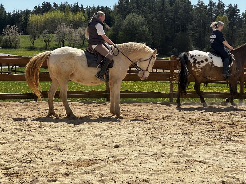 🌟 Charmanter Lusitano Wallach in Sonderfarbe Cremello – Barocker Traumtyp 🌟 Anzeigentext: Du suchst einen kräftigen Partner mit dem gewissen Etwas? Dann ist dieser 6-jährige Lusitano (ohne PSL-Papier) genau das richtige Pferd für dich! Dieser bildschöne Wallach in der seltenen Farbe Cremello besticht nicht nur durch seine Optik, sondern vor allem durch seinen absolut liebenswerten Charakter. Er ist ein echter "Quatschkopf", der die Aufmerksamkeit seines Menschen liebt und einen ständig spielerisch dazu auffordert, Zeit mit ihm zu verbringen. Ausbildung & Talente: Vielseitig vom Boden: Er ist bestens in der Zirzensik und Bodenarbeit vorgebildet. Seitengänge, Übertreten und sogar das Hinlegen auf Kommando beherrscht er bereits sicher. Geländeprofi: Er wurde schonend angeritten und war bisher hauptsächlich im Gelände unterwegs. Dort zeigt er sich super brav und unerschrocken. Fein & Konzentriert: Ob bei Kursen oder in der täglichen Arbeit – er zeigt sich stets lernwillig, fein an den Hilfen und voll auf seinen Reiter fokussiert. Aktueller Stand: Er wird derzeit weiter auf dem Platz ausgebildet, um die Lektionen vom Boden nun auch unter dem Sattel zu festigen. Er lernt extrem schnell und möchte gefordert werden. Eigenschaften: Charakter: Menschenbezogen, neugierig, verspielt und sehr lernfreudig. Handling: Absolut schmiede- und verladefromm. Er fährt souverän auf dem Hänger und ist auch in fremder Umgebung (z. B. auf Kursen) tiefentspannt. Typ: Kompakter, kräftiger Barocktyp – deckt auch größere Reiter gut ab. Das ideale Zuhause: Er wünscht sich einen Menschen, der Lust hat, gemeinsam mit ihm weiter zu lernen und seinen Spieltrieb zu schätzen weiß. Er ist kein „reines Sportgerät“, sondern ein Partner fürs Leben, der für jeden Spaß zu haben ist. Eckdaten im Überblick: Rasse: Lusitano (Typ) Farbe: Cremello Alter: 6 Jahre Ausbildungsstand: Geritten / Fortgeschrittene Bodenarbeit Bei Interesse freue ich mich über eine Nachricht mit einer kurzen Vorstellung, wo er hinkommen würde. Ein Kennenlernen ist nach Absprache natürlich möglich!