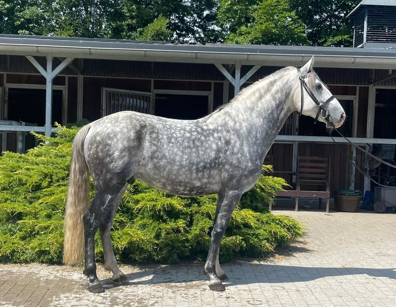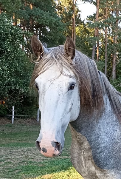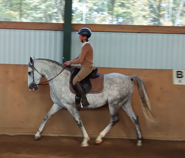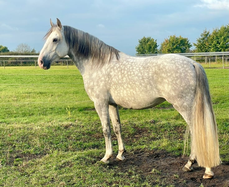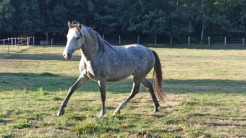 Opus HR, a Lusitano of fine lineage bred in Germany. Born 06.2018. Raised in a species-appropriate manner (only turned out this year), year-round pasture, in the company of a gelding on 1.2 hectares. Naturally with an open stable, top-quality hay, and mineral feed. Started under saddle at 5, and training has continued this year. He shows himself to be very well-behaved and hardworking under saddle. Learns quickly and brings joy. Also cool in the terrain. Opus trusts humans and is easily convinced when faced with new challenges. In free movement, he shows himself to be very agile and jumps changes very smoothly. The very well-angled hindquarters make this easy for him. Gradually, this advantage is also becoming evident under saddle. He handles every new challenge well. He has never been sick, not even a cough. Regular deworming, vaccinations, and hoof care should go without saying. Unfortunately, this wonderful horse is too small for me. For questions and if interested, please feel free to call. Videos available upon request.