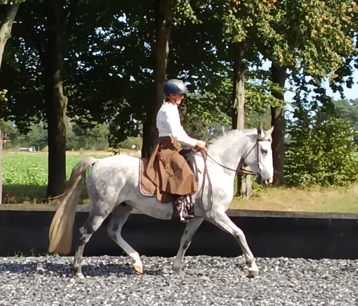 Opus HR, een in Duitsland gefokte Lusitano van fijne afstamming. Geboren in 06.2018. Dierlijke opfok (pas dit jaar gelegd), het hele jaar door op de wei, in gezelschap van een ruin op 1,2 hectare. Natuurlijk met een open stal, eersteklas hooi en mineralenvoer. Aangereden op 5-jarige leeftijd en dit jaar de opleiding voortgezet. Hij toont zich zeer braaf en werklustig onder het zadel. Leert snel en brengt plezier. Ook cool in het terrein. Opus vertrouwt de mens en laat zich bij nieuwe uitdagingen gemakkelijk overtuigen. In de vrije loop toont hij zich zeer wendbaar en springt heel soepel van wissel. De zeer goed gehoekte achterhand maakt het hem gemakkelijk. Langzaam komt dit voordeel ook onder het zadel naar voren. Hij beheerst elke nieuwe uitdaging goed. Hij is nooit ziek geweest, zelfs niet eens hoesten. Regelmatige ontworming, vaccinatie en hoefverzorging hoeven niet genoemd te worden. Helaas is dit prachtige paard te klein voor mij. Voor vragen en bij interesse kunt u gerust bellen. Video's op aanvraag.
