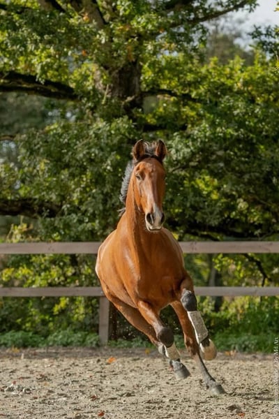 PALERMO DE ST JEAN ist ein Lusitano-Thoroughbred-Gelding. Sein Vater ist der berühmte ESCORIAL SRB, Teilnehmer bei den Olympischen Spielen 2021 und den Weltmeisterschaften 2022, ein direkter Nachkomme von SPARTACUS CSM. Seine Mutter, DANOUK DE ST JEAN, ist die Tochter von VIOLINO DO RETIRO. PALERMO DE ST JEAN wurde in Frankreich gekauft und später nach Portugal gebracht, wo er mehrere Jahre liebevoll betreut wurde. Er ist ein menschenbezogenes und intelligentes Pferd, das sich unter dem Sattel schnell weiterentwickelt. Er ist bequem, leicht zu reiten, stets vorwärts gerichtet und wurde im Brocéliande-Wald ausgebildet. Seine Gänge, mit gutem Hinterhandauftritt, seinem leichten Kontakt und seinem kompakten Körperbau machen ihn auf natürliche Weise für die Dressur geeignet. Er ist zuverlässig und angenehm im Gelände zu reiten und besitzt auch Potenzial für eine Karriere in der Working Equitation. Man schließt schnell eine Bindung zu PALERMO – er ist ein Pferd mit Feuer unter der Oberfläche, eine außergewöhnliche Persönlichkeit.