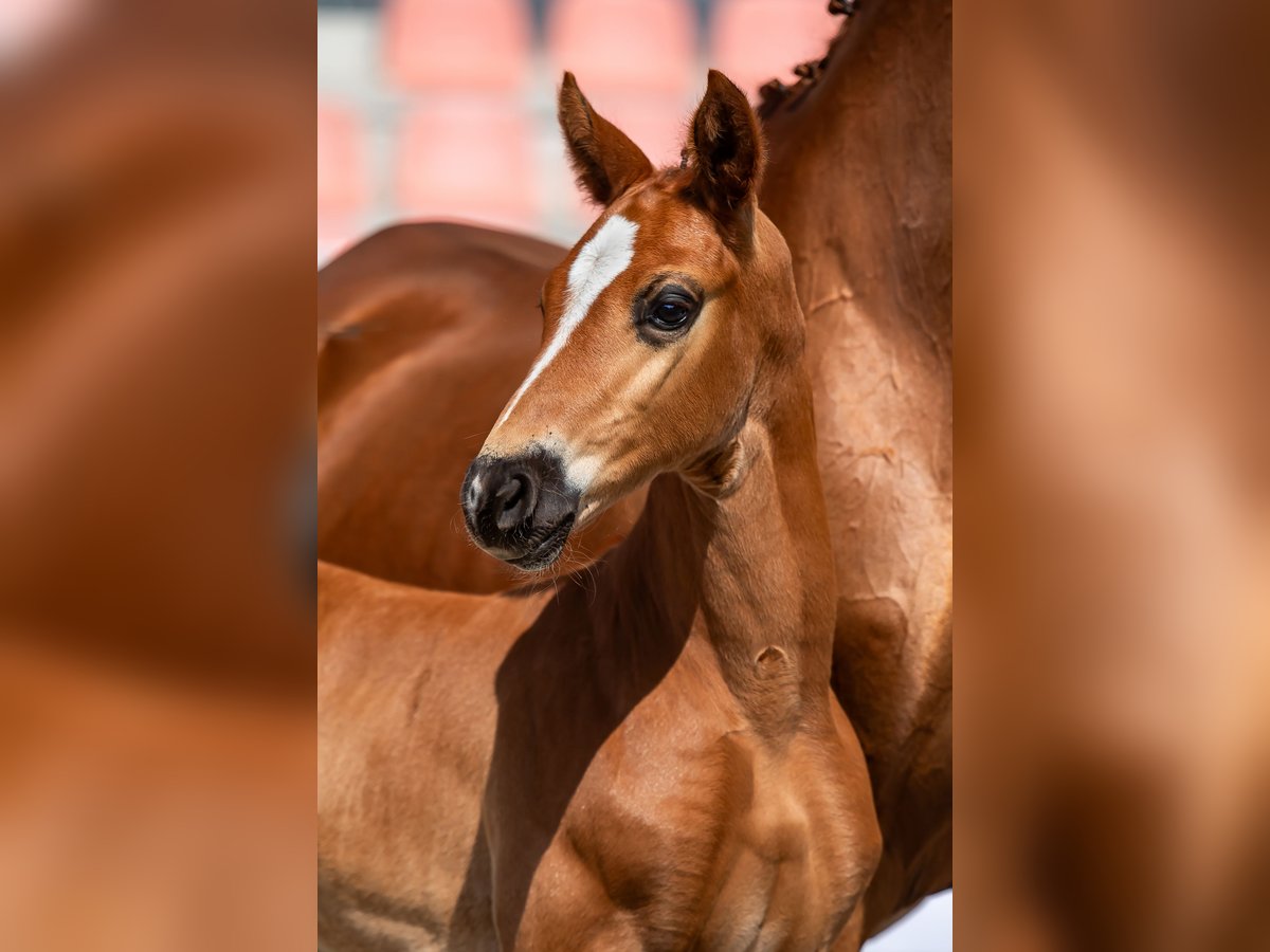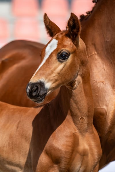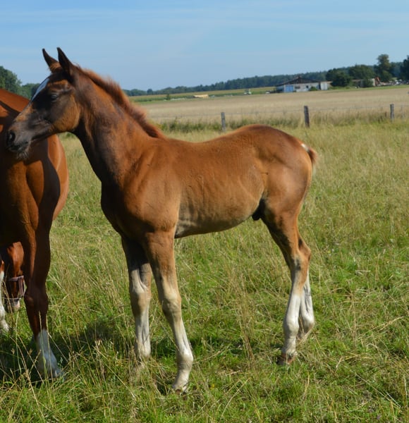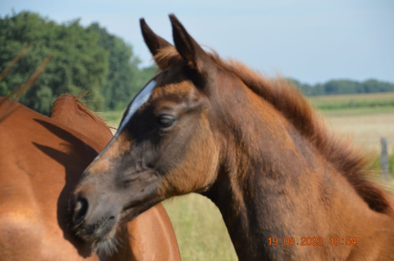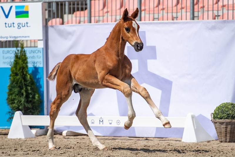 "Pedigree: Go for Romance/Rascalino/Willem ́s As born: 11.05.2023 I Stallion I Color: Fox Auszeichnung/Award: Elitefohlenprämie/Elite foal premium This modern foal knows how to please with its uphill gallop, its dry expressive and its active movement! Its harmonious proportions and eye-catching collar reveal the dressage horse of the future! Sir Go for Romance PS is a highly frequented stallion of the Redefin State Stud. Even in his young breeding career, he can look back on numerous elite and association premium foals. The stallion passed his 50-day test with an overall score of 8.07 in Adelheidsdorf. In particular, his rideability and willingness to perform were rewarded by the judges with a 9.0. In terms of sport, victories and placings in dressage horse tests class A are attributable to Go for Romance PS. Mother Rubina leads with Rascalino/Wilhelm's As/Abajo xx old, proven, Hanoverian blood! She herself won the 1st prize at the club show in Tarmstedt and recorded placings in A-dressage. 1st generation: Bergkristall ́s Burlington (DRE: M-victorious); Lilly Belle by Limonite (DRE: L-victorious) 2nd generation: Pedro v. Peridot (DRE: L-successful) 3rd generation: successful offspring: Annakreone by Abajo xx 1.20m jumping Other successful horses from this dam line are: Dressage horses: Leonard by Legat (M*-successful), Hidalgo by Hofrat (Grand Prix successful) Jumping horses: Kirke by Kolibri (1.40m successful), Sarafino by Sao Paulo (1.30m successful), further information can be found at/you can find further information at: https://www.horsetelex.de/horses/pedigree/1587815/rubina"