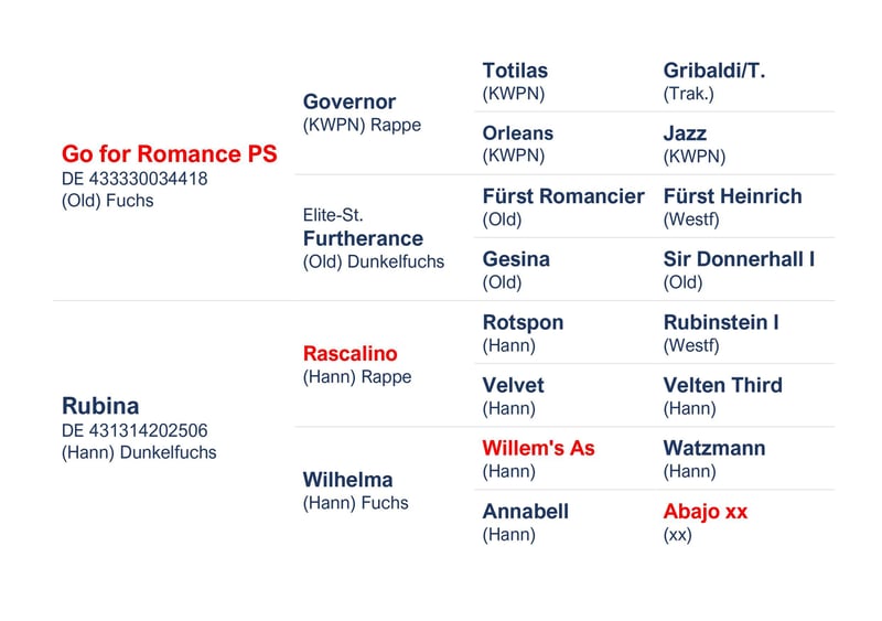 "Pedigree: Go for Romance/Rascalino/Willem´s As Geb.: 11.05.2023 I Hengst I Farbe: Fuchs Auszeichnung/Award: Elitefohlenprämie/Elite foal premium Dieses moderne Fohlen weiß mit seiner Bergaufgaloppade, seinem trockenen ausdrucksstarken und seinem aktiven Bewegungsablauf zu gefallen! Seine harmonischen Proportionen und die auffällige Halsung lassen das Dressurpferd der Zukunft erkennen! Vater Go for Romance PS ist ein hochfrequentierter Hengst des Landgestüts Redefin. Bereits in seiner jungen Zuchtkarriere kann er auf zahlreiche Elite- und Verbandsprämienfohlen zurückblicken. Seinen 50-Tage Test legte der Hengst mit der Gesamtnote von 8,07 in Adelheidsdorf ab. Besonders seine Rittigkeit und Leistungsbereitschaft belohnten die Richter mit einer 9,0. Sportlich gehen Siege und Platzierungen in Dressurpferdeprüfungen Klasse A auf das Konto von Go for Romance PS. Mutter Rubina führt mit Rascalino/Wilhelm`s As/Abajo xx altes, bewährtes, hannoversches Blut! Sie selbst erlangte den 1.Preis auf der Vereinsschau in Tarmstedt und verzeichnete Platzierungen in A-Dressuren. 1. Generation: Bergkristall´s Burlington (DRE: M-siegreich); Lilly Belle v. Limonit (DRE: L-siegreich) 2. Generation: Pedro v. Peridot (DRE: L-erfolgr.) 3.Generation: sporterfolgreicher Nachkomme: Annakreone v. Abajo xx 1,20m Springen Weitere erfolgreiche Pferde aus diesem Stamm sind/ Other successful horses from this dam line are: Dressurpferde/Dressage horses: Leonard v. Legat (M*-erfolgr.), Hidalgo v. Hofrat (Grand Prix erfolgr.) Springpferde/Jumping horses: Kirke v. Kolibri (1,40m erfolgr.), Sarafino v. Sao Paulo (1,30m erfolgr.), weitere Informationen finden Sie unter/you can find further information at: https://www.horsetelex.de/horses/pedigree/1587815/rubina"
