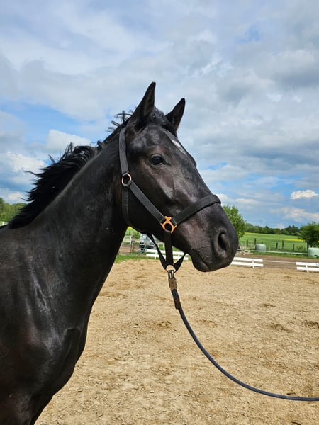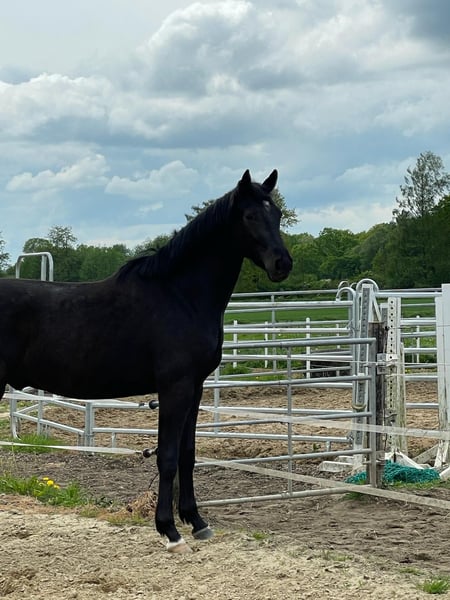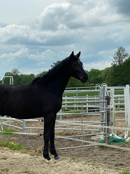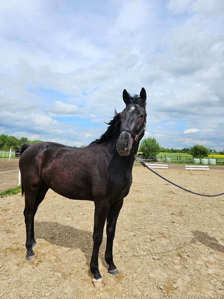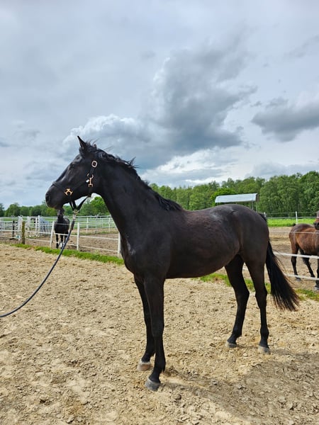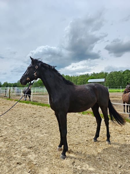 Dark Diamond Born 04.04.2022 This black, gentle giant with a current height of 1.69 m is for sale. We estimate his final height to be approx. 1.80 m. Dark Diamond is a real buddy, strong, curious, beautiful springy gaits and will go through thick and thin with you in life. He impresses with his beauty and size and is always sweet and cuddly. Dark Diamond was born on 04.04.2022 and is growing up in a mixed herd. He is vaccinated against influenza and tetanus and knows the ABCs of young horses. Directly from a private, loving and familiar breeder. Videos can be sent via PN