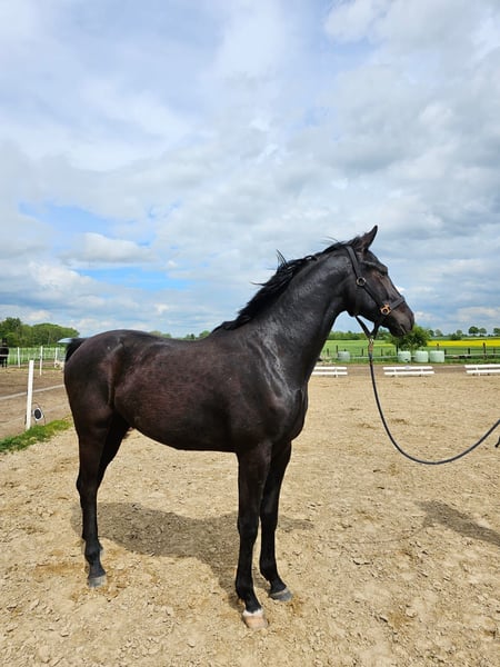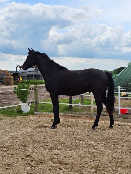 Dark Diamond Geb.04.04.2022 Zum Verkauf steht dieser schwarze, sanfte Riese mit einem jetzigen Stockmaß von 1,69m. Sein Endmaß schätzen wir auf ca. 1,80 m. Dark Diamond ist ein echter Kumpel, nerverstark, neugierig, schöne federnde GGA und wird im weiteren Leben mit dir durch dick und dünn gehen. Er besticht sehr durch seine Schönheit und seine Größe, zudem ist er immer lieb und verschmust. Dark Diamond ist bei uns am 04.04.2022 geboren und wächst in einer gemischten Herde auf. Er ist Influenza, Tetanus geimpft und kann das ABC des Jungpferdes. Direkt vom privaten, liebevollen und familiären Züchter. Videos können über PN verschickt werden