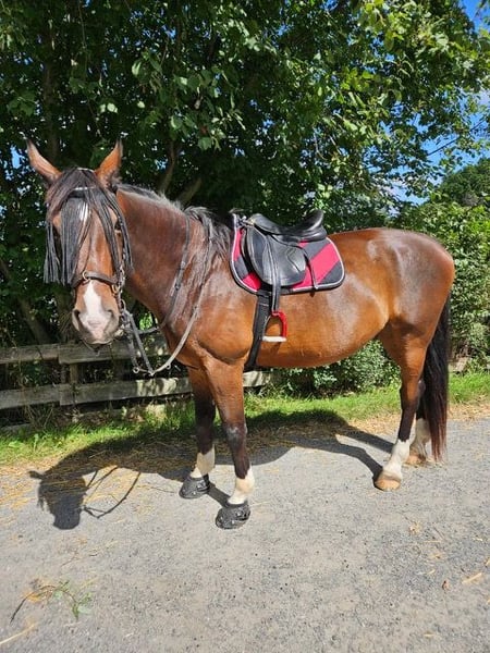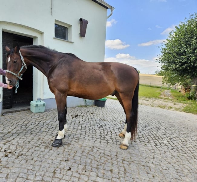 Great reliable horse with a super character! Sabo is a wonderful and handsome gelding, born in 2011 and approximately 169cm tall. He comes from the Ganschow stud and was professionally trained in A-level dressage there. He is absolutely clear-headed, has a balanced and calm demeanor, and sometimes asks if he can make decisions - but if you are consistent, he accepts this immediately. He is a bit afraid of cows (which can possibly be worked on with calmness and patience). Sabo loves trail rides in company but also goes out alone. He knows and loves small jumps, is familiar with lunging, loads well onto the trailer, and is very well-behaved with the farrier. A vet check from 2017 is available with no findings. In January 2025, a suspensory ligament injury was diagnosed on the right hind leg; the leg is now cold and there is a good recovery status. In September 2025, a final ultrasound will be done, and then a plan will be created for how he can trot and subsequently canter. At the moment, he is being exercised at the walk, including trail rides and walks in nature, bathing, light groundwork, etc. He has been doing this very well for a few months. Otherwise, he immediately responds to what is asked of him and can be ridden by anyone. In the future, he should not be trotted or cantered for hours daily in a small indoor arena. Daily walking is not a problem, hard ground is good, and shorter trotting and cantering sessions in the field or on the arena after about 20 minutes of warming up will definitely be possible again. A dressage saddle (17.5 inches, medium width) from Loxley from 2019 and a VS saddle from Canaves One (18 inches, medium width), bridle (Micklem Bridle), various halters, reins, lead ropes, saddle pads, winter blankets, hoof boots, and various small items can be purchased for an additional cost of approximately €2,500. Father: Sir Galanto, Grandfather: Stedinger Mother: Belladonna II, Grandmother: Elite Jana Price: €7,800 He is unfortunately being sold due to personal circumstances. He is located in 02794 Leutersdorf and can be viewed at any time by arrangement.