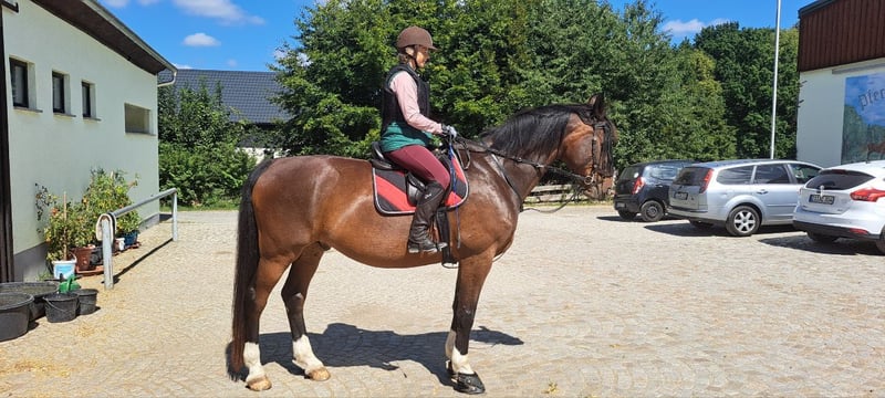 Sabo proviene dallo stallone Ganschow ed è stato addestrato professionalmente nel dressage di livello A. Sabo ha una mente molto chiara, ha un carattere equilibrato e tranquillo, ed è quasi sempre sereno, poiché non è molto sanguigno. Il suo trotto è energico, il galoppo è simile a quello di un cavallo a dondolo. Questo è molto piacevole. Ama le passeggiate in gruppo (ma va bene anche da solo), il lavoro in arena lo diverte, soprattutto quando ci sono piccoli ostacoli o barre da saltare. In arena/ maneggio è montabile da chiunque. Nel terreno reagisce di solito in modo calmo e ama seguire. Tuttavia, è facilmente spaventato da mucche o quando deve scoprire qualcosa di sconosciuto (allora è un po' insicuro e deve essere convinto). A volte chiede se può decidere. Se si rimane coerenti, accetta subito. È molto facile da gestire alla longia in tutte le andature e risponde immediatamente a ciò che gli viene richiesto. Con un po' di pratica, sale sul rimorchio (inizialmente un po' titubante, perché non lo fa spesso). È molto collaborativo con il maniscalco. Per completezza, menziono che Sabo ha avuto un infortunio completamente guarito al legamento sospensore. Può e sarà montato di nuovo completamente, con future piccole limitazioni per quanto riguarda il lavoro in maneggio. Vendo insieme al cavallo anche due selle. Una sella da dressage (17,5 pollici, larghezza media) della ditta Loxley del 2019 e una sella VS della ditta Canaves One (18 pollici, larghezza media). Se entrambe le selle vengono acquistate, inclusi ulteriori accessori abbondanti, il prezzo è di 2.500 €. La sella da dressage è stata completamente ripristinata lo scorso anno ed è stata utilizzata poco da allora a causa del passaggio alla sella VS. Per Sabo desidero qualcuno che ami lunghe passeggiate o escursioni a cavallo. Lo vendo solo perché la mia situazione familiare e finanziaria è cambiata molto. Padre: Sir Galanto Madre: Belladonna II Prezzo: 7800 Euro Si trova a 02794 Leutersdorf.