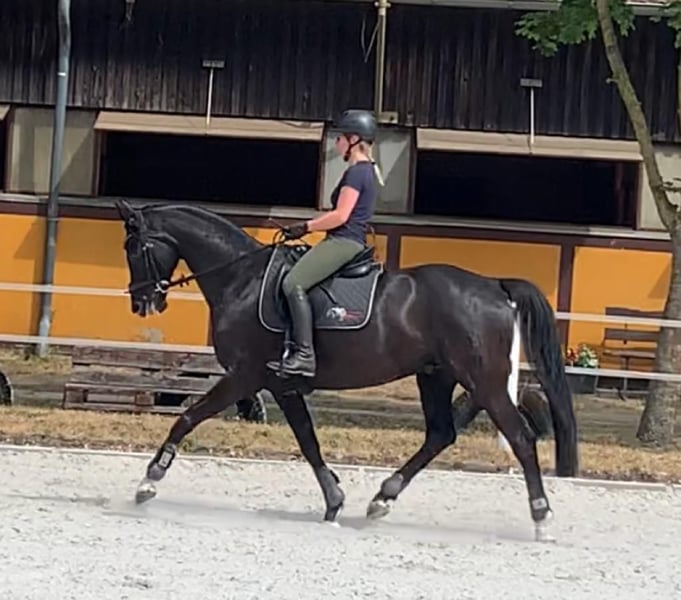 Cyrus ist ein 15-jähriger Mecklenburger Rappwallach und sucht wegen Aufgabe des Reitsportes ein neues Zuhause. Er ist ca. 1,68 m groß, schmiede- und verladefromm, regelmäßig geimpft und entwurmt sowie beim Pferdezahnarzt und Physiotherapeuten vorgestellt. Er steht bei uns in einer kleinen Wallachherde, ist aber auch mit Stuten verträglich. Insgesamt ist er im Umgang sehr artig und unkompliziert. Cyrus ist ein sensibles, ehrliches und charakterstarkes Pferd mit drei guten Grundgangarten. Er braucht einen erfahrenen Reiter, der ihm mit viel Einfühlungsvermögen und Konsequenz zugleich eine Linie vorgibt. Er ist daher ausdrücklich kein Kinder- und Anfängerpferd sowie für Reitschulen o.ä. ungeeignet. Er wird bei uns dressurmäßig bis L geritten und geht mit einem sicheren Reiter, dem er vertraut, artig ins Gelände. Cyrus hat eine alte, verheilte Verletzung am Röhrbein, die er sich bereits bei seinem Vorbesitzer zugezogen hat und die ihm bei uns keinerlei Beschwerden bereitet hat. Wir wünschen uns für Cyrus ein schönes Zuhause als Freizeitpferd mit regelmäßigem Koppelgang, in dem er umsorgt wird und alt werden kann. Er wird schweren Herzens und nur in allerbeste Hände abgegeben, wenn alles passt. Cyrus wird mit einem angepassten, neuwertigen Dressursattel von Passier und weiterem Zubehör abgegeben. Bei ernsthaftem Interesse freuen wir uns über eine nette Nachricht.