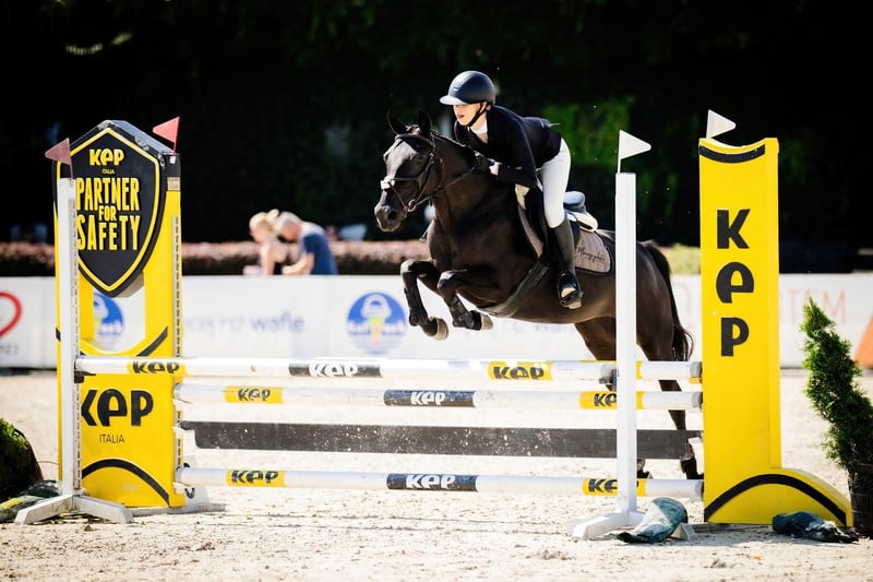 S-Korsyka (Krysia) is a 9-year-old small horse mare, standing at 145 cm. An agile and quick pony, she has achieved numerous top placements up to 100 cm in national and regional competitions, including 4th and 5th place at the Polish Championships in category A2, after her initial starts at D-bis level. She is easy to handle both on the ground and during transport, easily entering trailers and horseboxes. Well-behaved in the field, she is calm and not spookish; she is unbothered by various obstacles such as walls, colors, or scare devices. Sold due to her rider's growth.
