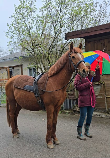 À vendre, notre jument poney sportive Dakota, que nous possédons depuis deux ans. Lors de son achat, elle était gestante – nous conserverons le poulain, c’est pourquoi nous confions Dakota à un nouveau foyer. Chez son ancienne propriétaire, elle était principalement utilisée en promenade, tandis que chez nous, elle a été principalement monté en extérieur. Elle se montre obéissante, travailleuse et motivée, même avec de jeunes cavalières. En travail à la longe, elle a encore besoin d’un peu de constance. Lorsqu’on la mène ou qu’on la longe, elle tente parfois de s’échapper. Dès qu’elle se rend compte que cela ne fonctionne pas, elle redevient immédiatement calme. Santé / soins : - Dents traitées - Vaccinée régulièrement - Déparasitée régulièrement Conditions de vie : - Habituée au box en paddock ouvert (groupe de juments) - Rangée basse et sociable Avec un peu plus de travail et de confiance, Dakota peut devenir un excellent cheval de loisir, voire un cheval d’école. N’hésitez pas à nous contacter si vous êtes intéressé.