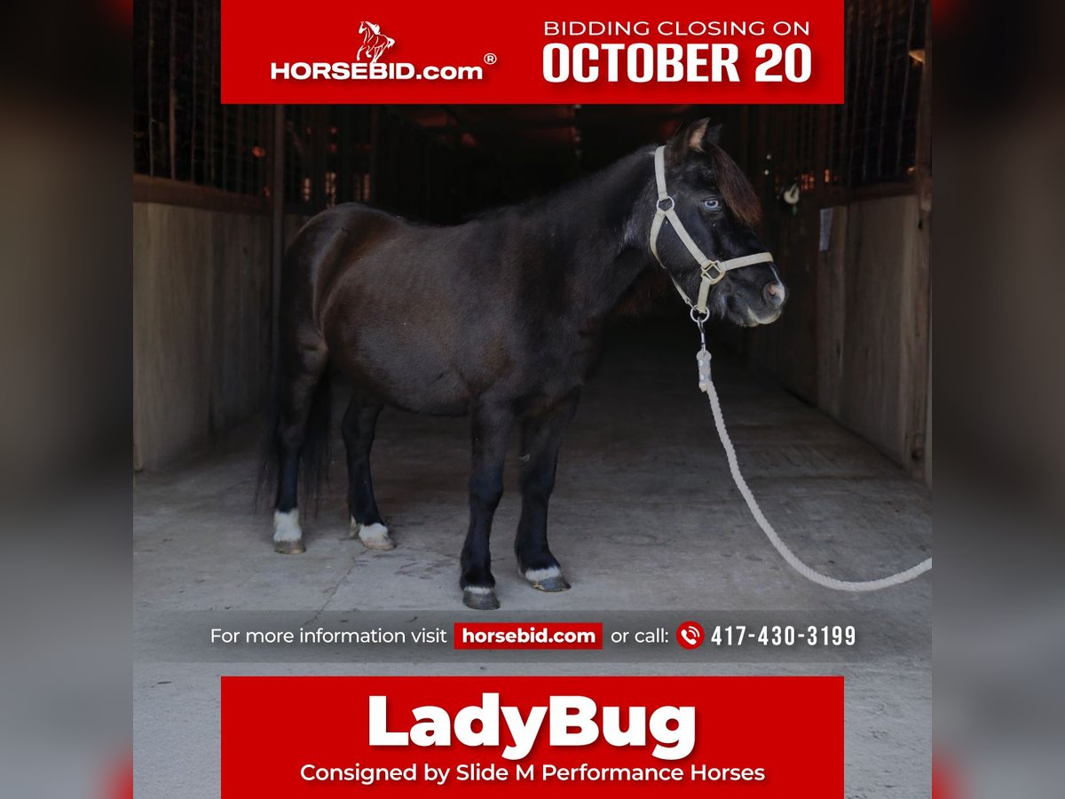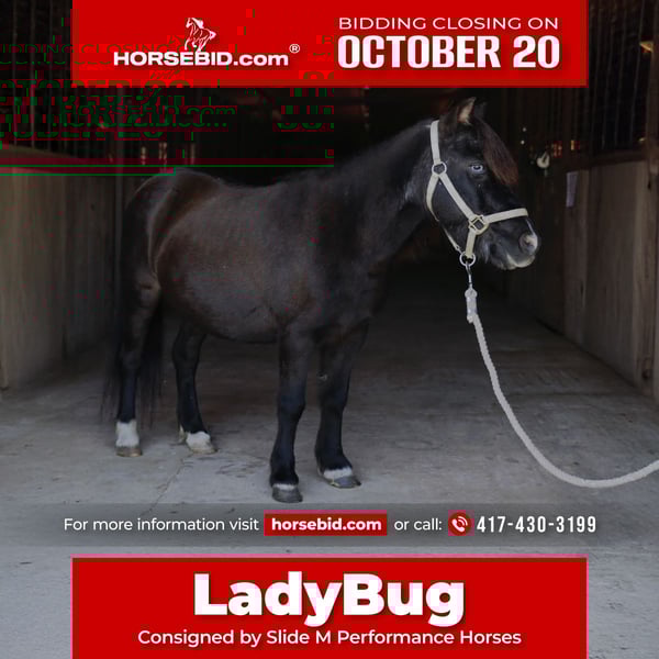 ♦️ 𝐭𝐡𝐞 𝐀𝐌𝐄𝐑𝐈𝐂𝐀𝐍 𝓕𝓪𝓵𝓵 𝓒𝓵𝓪𝓼𝓼𝓲𝓬 ♦️ Happening now thru MONDAY | OCTOBER 20th - Available EXCLUSIVELY on HorseBid's website! For more details and to register visit: www.Horsebid.com CONSIGNOR CONTACT: Slide M Performance Horses 417-430-3199 LOCATION: Mount Vernon, MO BREED: Miniature REGISTERED: No COLOR: Black HEIGHT: 37” AGE: 10 GENDER: Mare The perfect example of a pocket pony! Ladybug is the sweetest mini you’ll find—always the first to meet you at the gate and ready to soak up love from the kids. She has spent most of her life teaching little ones to ride and is truly a fantastic teacher. Lady is perfect for lead line (she’ll follow anyone around without even needing a rope), can be ponied off a big horse, or will happily carry your kiddos off on their own. Recently, she’s been helping two little girls, ages 3 and 4, gain confidence in the saddle. They’ve ridden her in parades, 4-H shows, and barrel races, and Lady takes it all in stride. She’s super quiet, steady, and never blinks an eye—whether she’s in the arena, at a show, or out on the trail. She’s patient with all the kids’ shenanigans too, from flapping tarps and kicking balls around to jumping, crossing water, and just being climbed on. Not only is Lady broke to ride, but she’s also broke to drive a cart! She fits right in whether turned out with minis or full-sized horses, or kept in a stall. She’s not buddy or barn sour and has absolutely no kick, rear, or bite. Ladybug is everything you want in a kids’ pony—safe, steady, fun, and versatile. She’s happiest strolling along at a walk with the little ones, but she can also keep up with the big horses when needed. A true gem for any family!