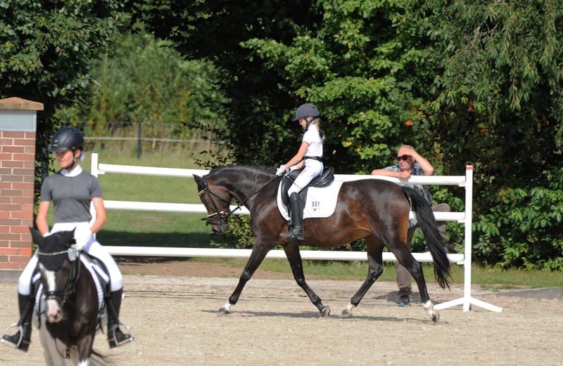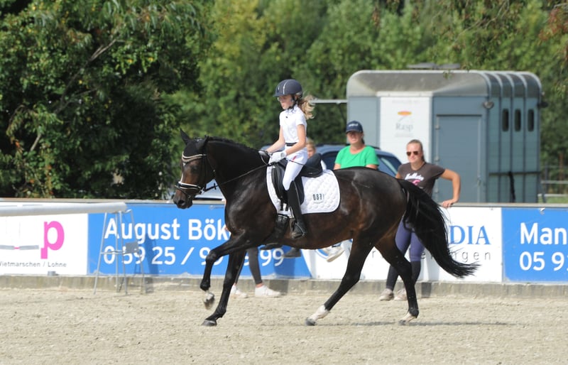 Very well-behaved, experienced, and reliable 15-year-old dark bay pony mare, standing at 1.48 meters. Rainbow Angel is highly trained and has competed in dressage up to M* level. She also shows talent in jumping but has only been shown in dressage competitions so far. She has excellent movement, is familiar with flying changes, and is easy to handle, making her suitable for children. She accompanied two of our granddaughters during riding lessons and was also introduced to competitions by the girls — from riding trials and junior rider tests to A-level classes. She consistently performs well during rides and in the terrain. The mare is fit and healthy and ready for immediate use. She is accustomed to transport in trailers, loads easily — even for children — and is well-behaved with the farrier. A veterinary check was carried out about two years ago, with no notable issues.