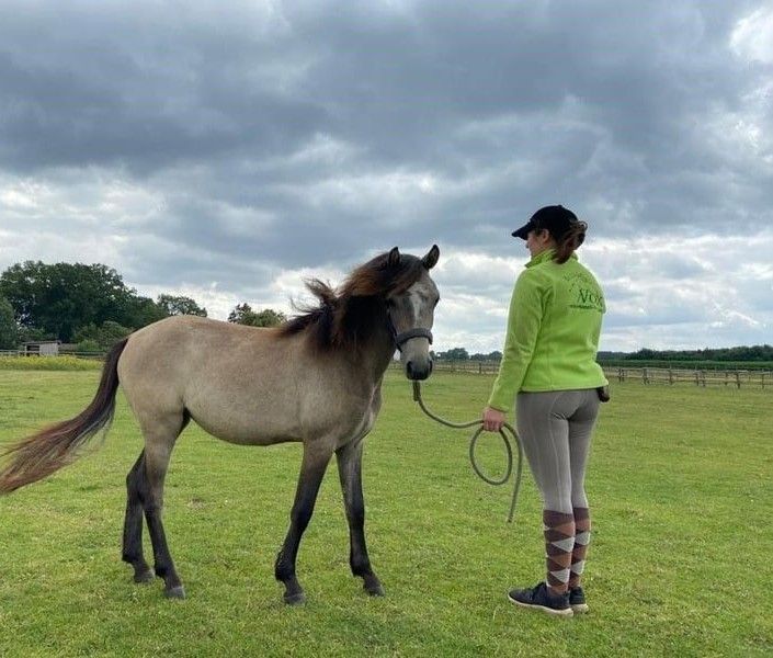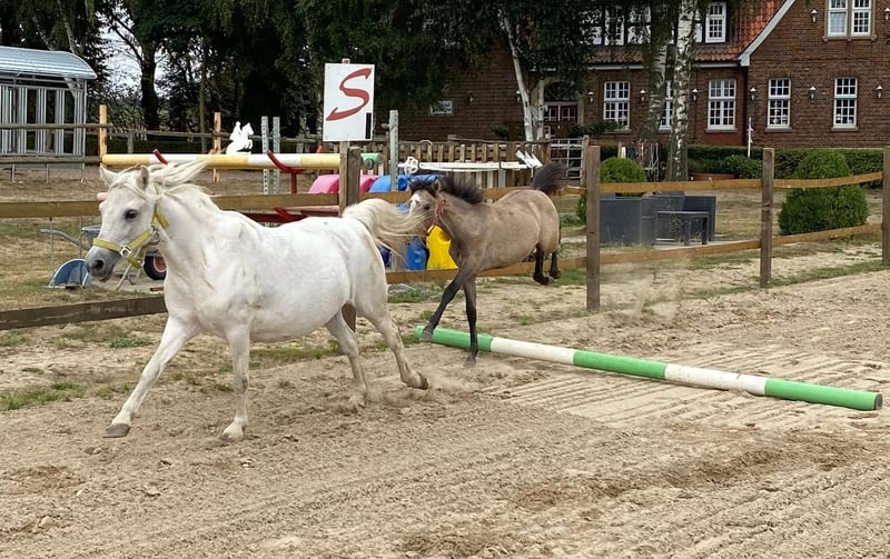 Nituna ist bei uns geboren und von der ersten Minute an in unsere Reiterhotel mit integriert. Das heisst sie kennt lachende und tobende Kinder, Hunde, Pfauen und rund herum alles was zum Zusammenleben dazu gehört. Nach den ersten 6 Monaten mit Mama und einem weiteren Mama&Fohlen-Team wurde sie in einer großen Herde gehalten. Dort hat sie sich dann pferdegerecht selbst abgsetzt und ist völlig unbeschwert und ohne Stress in die Teeny Phase gerutscht. Ihr aktueller Ausbildungsstand: Führtraining, Gelassenheitstraining und Trailparcoure. Ist bereits an Sattel und Trense gewöhnt und kennt Reitergewicht. Die ersten Ausritte hinter einem erfahrenen Pferd sind gemeistert. Natürlich geht sie regelmässig zum Schmied und ist entwurmt. Ihr Equidenpass ist selbstverständlich vorhanden inkl. Mikrochip. Nituna lebt in großen Herde mit erwachsenen Ponys und Youngstern. Nituna ist eine ausdrucksstarke, bewungstalentierte und wissbegierige junge Dame, die sicherlich ein tolles Reitpony abgeben wird. Ihre Mutter wird bei uns von kleinen Reitgästen geritten und hat ihrer Tochter eine Menge an Fleiß und Kinderverstand weiter vererbt. Die Mutter kann hier auf dem Hof ebenfalls besichtigt werden :) Zusammenfassung Nituna: FalbSchimmel - Stute - 21.04.2022 geb. - sehr gut angeritten - 100% liebenswert - 3950 € VHB Gerne kontaktieren Sie uns persönlich unter Tel.: 05435443 oder 01705824297 (nur Telefonat - keine Nachrichten!!!) Rückrufe sind nur unter der Tel.: 05435443 zu vereinbaren. Die hier beschriebenen Eigenschaften sind Erfahrungen die WIR mit dem Pferd gemacht haben. Pferde sind LEBEWESEN und spiegeln das Gegenüber!