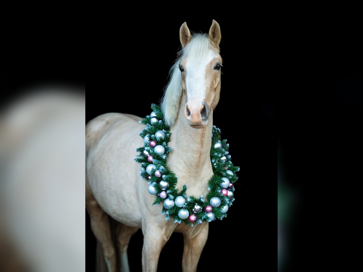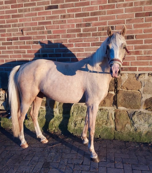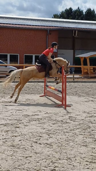 Hello, After much consideration, we have decided to sell our 5-year-old Palomino mare. She is approximately 145 cm tall, has been ridden since she was 4 years old, and has seen a lot in her young life. She jumps beautifully, including cross-country obstacles, handles the terrain confidently, and is very well-behaved even around my 9-year-old daughter. This year, she was introduced to dressage and was able to achieve some placings. "Palina" is very affectionate and enjoys human company, but she can also show her mare-like side and be a bit lively at times. However, she is never mean—she does not kick, bite, or buck. She is a lovely pony that, with proper training and encouragement, will undoubtedly become a wonderful partner for sport and leisure. Videos available. Please feel free to contact me with any questions.