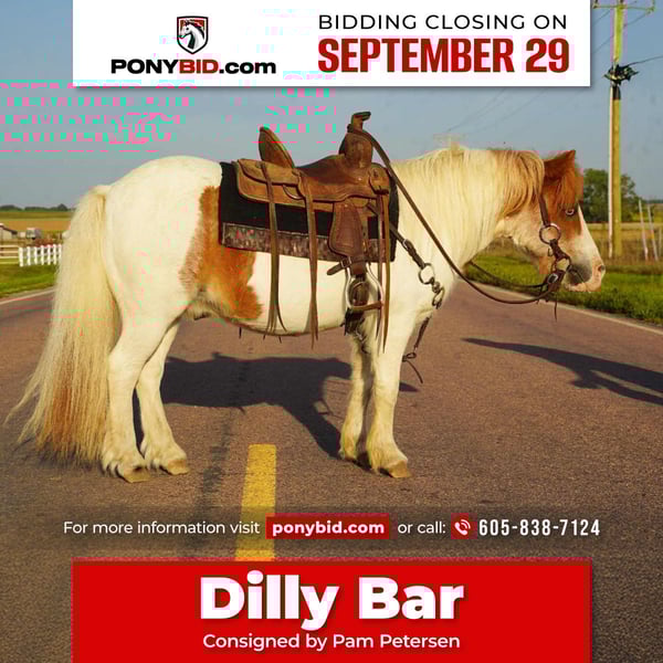 🐴 𝒕𝒉𝒆 𝐅𝐀𝐋𝐋 ℙ𝕆ℕ𝕐 𝑺𝒑𝒆𝒄𝒕𝒂𝒄𝒖𝒍𝒂𝒓🐴 Happening now thru MONDAY | SEPTEMBER 29th - Available EXCLUSIVELY on Ponybid's website! For more details and to register visit: www.Ponybid.com CONSIGNOR CONTACT: Pam Petersen 605-838-7124 LOCATION: Corsica, SD BREED: Pony REGISTERED: No COLOR: Paint HEIGHT: 40" AGE: 12 GENDER: Gelding Dilly Bar is an absolutely adorable 40 inch 12 year old, paint pony gelding. He's incredibly gentle, making him perfect for tiny kids or those just starting out. His calm nature makes him an excellent lead line pony, giving young riders the confidence they need. He's also great for trail riding, happily following behind bigger horses, no bad habits and super sweet and kind, he is super friendly loves treats, great to load and unload good ground manners, he is really a dream to have around.