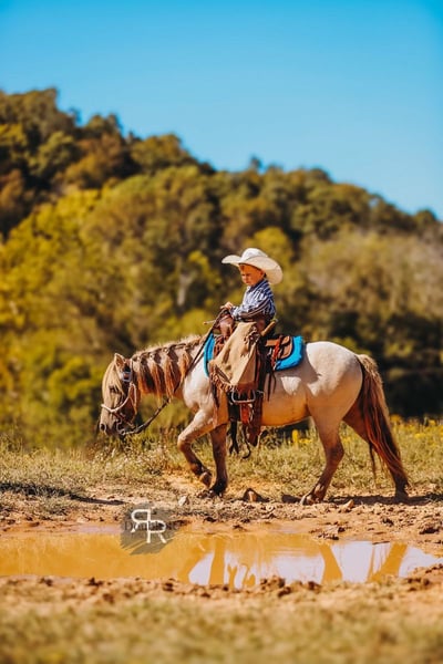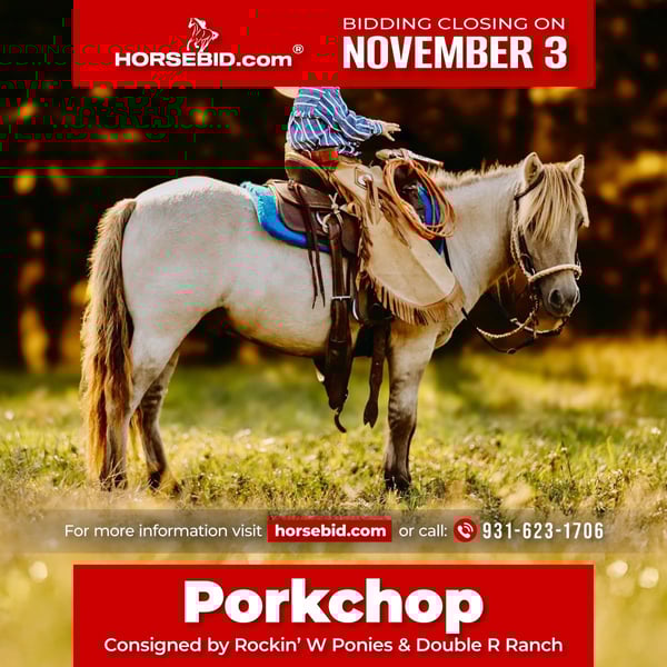 ⚜️𝐓𝐇𝐄 𝐅𝐀𝐋𝐋 𝐇𝐄𝐑𝐈𝐓𝐀𝐆𝐄 𝐂𝐋𝐀𝐒𝐒𝐈𝐂⚜️ Happening now thru MONDAY | NOVEMBER 3rd - Available EXCLUSIVELY on HorseBid's website! For more details and to register visit: www.Horsebid.com CONSIGNOR CONTACT: Rockin’ W Ponies & Double R Ranch 931-623-1706 LOCATION: Lyles, TN BREED: Miniature Horse REGISTERED: Yes REGISTERED NAME: AMW’s Mischief Maker COLOR: Dun HEIGHT: 40” AGE: 4 GENDER: Gelding Meet “Porkchop” The one, the only!! Registered Miniature Horse “AMW’s Mischief Maker” You may have already seen him creating smiles all over social media- Porkchop and his tiny riders have a way of stealing hearts wherever they go- and they have gone viral online more than a few times!! This cute little guy is full of personality, a true favorite everywhere we take him. He’s the kind of pony kids dream about, and parents value so much. Porkchop is solid, sturdy, and has a thick little build, he looks like a tiny Quarter Horse! He is made to last your cowboy or cowgirl through years of fun. At 4 years old and standing 40” tall- he’s got his whole life ahead of him, and he’s just the right size for a growing cowboy or cowgirl. Wade is 9 years old, and he has ridden Porkchop everywhere, as well as Cooper who is only 2- who requires an extra bit of patience while he tries to get it all right and ride like a big boy. Porkchop has been everywhere with us. Even in our house!! Being ponied behind daddy’s horse, down the trails, through the woods and fields, splashing in the creek, out to check deer food plots and to check cows too. He tags along to horse shows and jackpots, and even has won ribbons at the saddle club being the perfect little leadline pony, in barrels, poles and walk-trot. Porkchop is patient, forgiving, and always willing to try whatever the kids dream up. He may have little legs, but he keeps up well! From patient beginner lessons, to silly cowboy games, chasing “outlaws,” or just plodding quietly down the road, Porkchop takes it all in stride. He doesn’t get worked up by noise, dogs, or other animals, and he’s happy to pack around beginners, even if they’re still learning how to balance, steer, or get their tack on straight. He is a little steady Eddie - and gives kids the kind of safe, confidence-building rides that shape them into horsemen. To find all of this in a pony who is only four years old, is quite unheard of! He is a rare old soul, and worth every penny he brings. He has been trail ridden extensively, independently- is traffic safe, crosses water, logs, and ditches, and handles hills and rough country with ease. Porkchop may be pony-sized, but he has the heart of a big horse. He has been all over Buffalo River Trail ride, overnight camping as well. He is reliable, quiet and always ready for the next adventure! This little guy has even starred in a kids movie- as one of the bandits ponies! (Check it out on YouTube, on our Double R Ranch Horses channel) Unicorn ponies like Porkchop don’t come around often. He’s such a sweet little babysitter type who can’t wait to be will be loved and cherished by his next family. If you’ve been searching for a pony you can trust to help build the next generation of cowboys and cowgirls, Porkchop is the one. 100% sound, with a clean bill of health/recent Veterinary pre purchase exam! Located in Lyles, TN. Contact Rachel Vick at 931-623-1706 if you’d like to know more about Porkchop the Pony and see if he’s the right match for your cowboy or cowgirl!