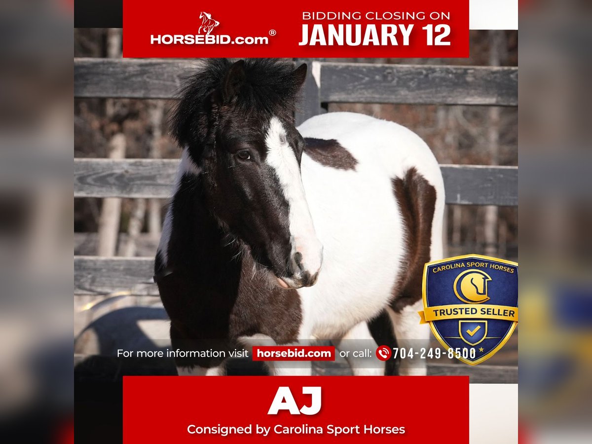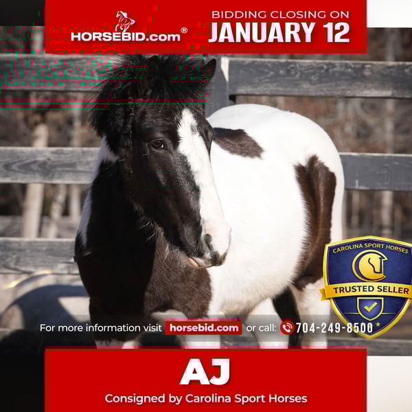 ♦️𝐍𝐄𝐖 𝐘𝐄𝐀𝐑'𝐒 𝑬𝒙𝒕𝒓𝒂𝒗𝒂𝒈𝒂𝒏𝒛𝒂♦️ Happening now thru MONDAY | JANUARY 12th - Available EXCLUSIVELY on HorseBid's website! For more details and to register visit: www.Horsebid.com CONSIGNOR CONTACT: Carolina Sport Horses 704-249-8500 LOCATION: Clover, SC BREED: Pony REGISTERED: No REGISTERED NAME: AJ COLOR: Black White Paint HEIGHT: 11.3 AGE: 5 GENDER: Gelding AJ is the kind of pony every family hopes to find — safe, steady, and genuinely happy taking care of his rider. He is quiet and confidence-giving under saddle, making him an excellent choice for children and families looking for a trustworthy, uncomplicated partner. AJ has a patient nature and offers the type of ride that allows kids to relax, learn, and enjoy their time in the saddle. One of AJ’s best qualities is his personality. He truly loves kids and attention and thrives in a family environment where he can be doted on and included. He is affectionate, kind, and enjoys being groomed, handled, and loved on, making him a barn favorite. AJ is easy to handle on the ground with excellent manners and is simple to tack, groom, and manage. He is well suited for arena riding, light trails, lessons, and all-around family enjoyment. Proudly offered by Carolina Sport Horses, AJ represents the quality, honesty, and emphasis on safety our program is known for. He is the type of pony we confidently place with families seeking a dependable, loving, and confidence-building partner. *All of our descriptions are OUR OPINION and ARE NOT FACTS. They represent how the horse responded and behaved while in our care. Horses can change at any time as they are living, breathing animals. There are no warranties expressed or implied via the descriptions above*PLEASE READ OUR BUYERS GUIDE PRIOR TO BUYING OR BIDDING ON ANY HORSE WE HAVE AVAILABLE. Interested in bringing AJ home? Give us a call today! Please take the time to read our Buyers Guide to answer any questions or concerns you may have. Contact Us Call or TEXT 704.249.8500