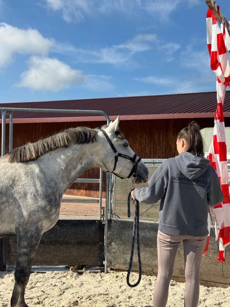 Dino ist 2021 geboren und seit einem Jahr unter dem Sattel. Wir haben uns gemeinsam viel erarbeitet, denn noch vor sechs Monaten war vieles nicht möglich, was ein Pferd eigentlich können sollte – dazu gehörten unter anderem Putzen, Hufe geben, Longieren und routiniertes Reiten. Er ist ein relativ dominanter Wallach, der den persönlichen Raum noch nicht vollständig akzeptiert und eine geringe Frustrationstoleranz hat. Er testet häufig Grenzen und braucht jemanden, der sehr klar ist. Jemanden mit Erfahrung im Jungpferdebereich, der ihn als seine Aufgabe sieht und ihm den Rahmen gibt, den er braucht. Am besten wäre ein reiner Wallach-Offenstall mit einem guten Herdenchef oder einer großen Herde. Wenn er seiner festen Bezugsperson vertraut, ist er ein wirklich toller Trainingspartner: super motiviert, lauffreudig und unerschrocken. Er liebt Ausritte, geht in allen GGA und ist sehr gut über die Stimme regulierbar. Außerdem ist er sehr menschenbezogen, lernwillig und macht sich in der Freiarbeit sehr toll. Zudem hat er ein gutes Grundfundament und ist stabil& funktionsfähig gebaut. Platz vor Preis Keine Anfänger Keine Händler Kein Schulbetrieb