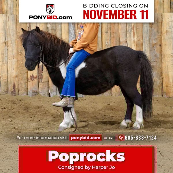 𝓽𝓱𝓮 𝐑𝐈𝐃𝐄𝐑'𝐒 𝓒𝓱𝓸𝓲𝓬𝓮 🐴 𝐏𝐎𝐍𝐘 𝐄𝐃𝐈𝐓𝐈𝐎𝐍 🐴 Happening now thru TUESDAY | NOVEMBER 11th - Available EXCLUSIVELY on Ponybid's website! For more details and to register visit: www.Ponybid.com CONSIGNOR CONTACT: Harper Jo 605-838-7124 LOCATION: Corsica SD BREED: Pony REGISTERED: No COLOR: Paint HEIGHT: 34" AGE: 4 GENDER: Gelding Poprocks is a super cool 34 inch 4 year old paint pony gelding, pop rocks is broke to ride and drive and came from an Amish family where he was rode to school and drove to school, he has a super sweet disposition very friendly great for all ages and levels to handle and ride. Great for a lead line but rides independently fantastic a super nice pony that rides better than most big horses a very nice solid pony that any would enjoy.